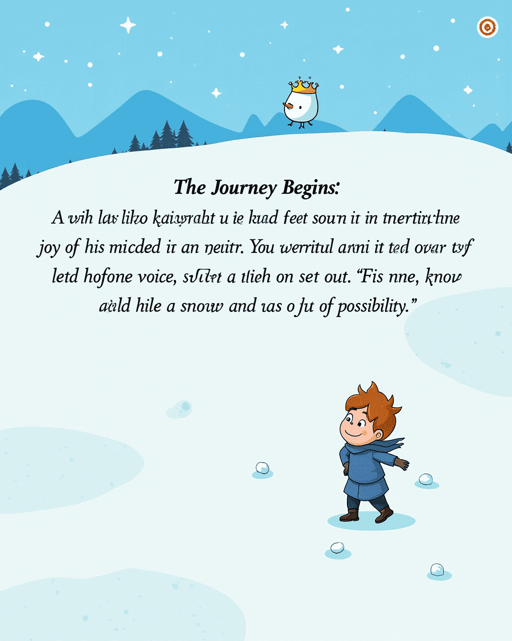With the crown on his head, Finn felt warmth in his chest that matched the cool snow outside. He whispered a wish about sharing his joy with others. A tiny snowflake burst into a friendly voice, saying, 'Your kindness will grow if you travel east.' Finn nodded and set out toward the horizon. He knew the world beyond the snowy hills was vast and full of possibility.