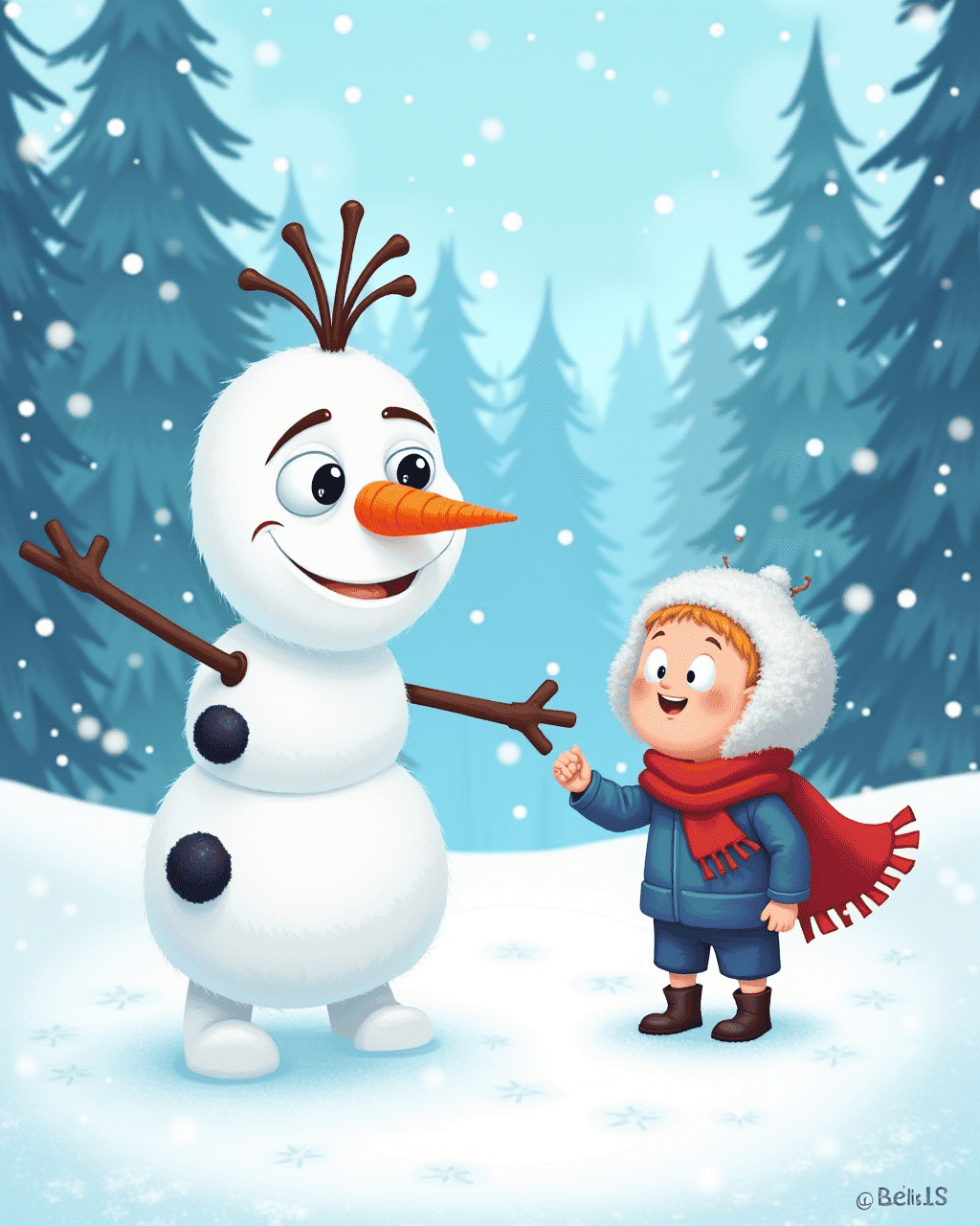In the forest, Finn met a grand snowman named Olaf. Olaf had a carrot nose and coal eyes that twinkled like stars. He asked Finn if he wanted a lesson on the importance of caring for friends. Finn laughed and accepted the idea, learning that kindness can melt even the hardest ice. Together, they built a snow fortress, feeling the thrill of teamwork.