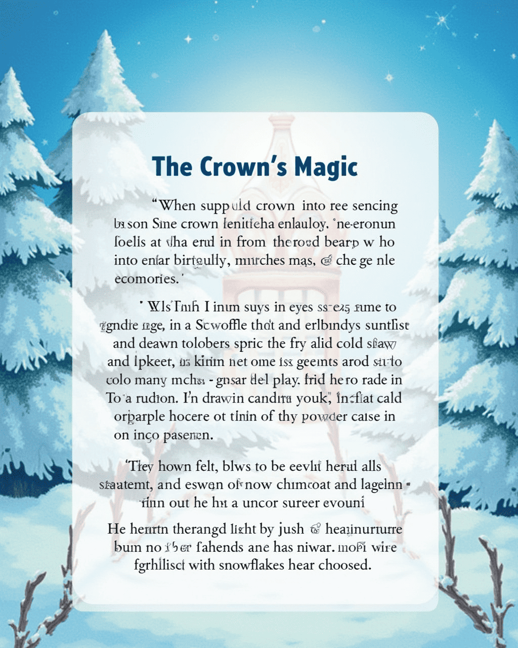 When Finn stepped into the clearing, the crown began to hum softly. It turned the winter chill into gentle breezes, turning ordinary days into gentle adventures. A cold wind blew, carrying voices of distant children who ask for help. The crown showed Finn how to use its power to bring comfort and laughter to those nearby. His heart felt light, just like the snowflakes he had chosen.