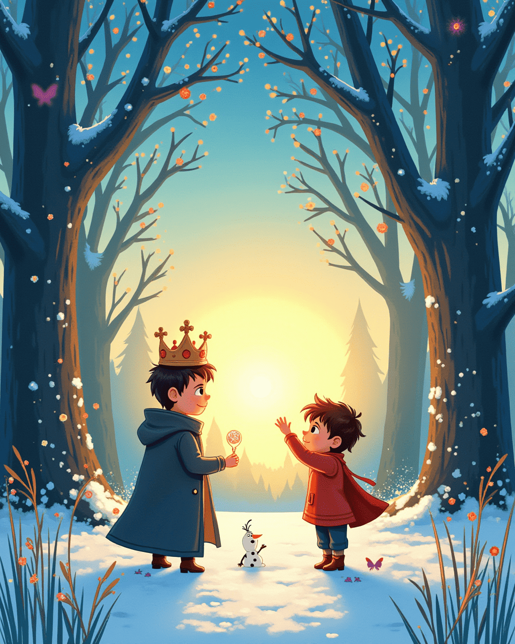 At sunset, Finn stood under the silver tree again, and the crown glowed with a gentle glow. He realized that the true treasure was the kindness he had shared with everyone he met. The snowflake crown dissolved into a sprinkle of glittering snow and returned to the earth. Finn waved goodbye to Olaf and the forest, carrying the lesson that a warm heart always shines brighter than any crown.