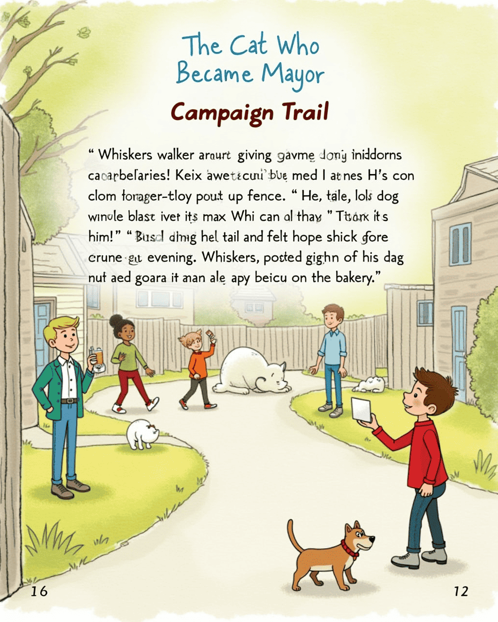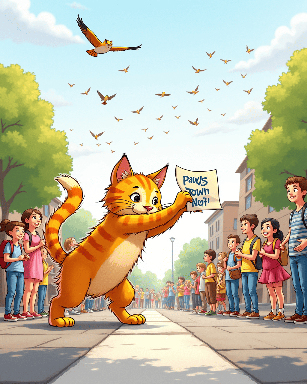 The mayor placed a big poster in the square: “Open for Mayor! Whiskers, the Cat, will help!” The townspeople laughed politely but also smiled at Whiskers’s determination. A flock of birds chirped from the trees, as if cheering on the new hero. Whiskers began to think of a campaign slogan: “Paws for a Better Town.” The children cheered, and the adults nodded approvingly.