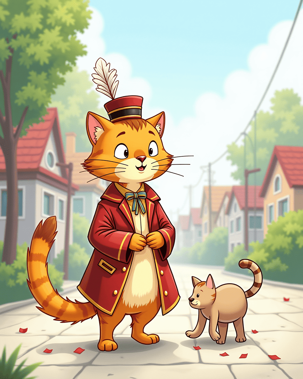 Now Whiskers stood with a tiny feathered hat, leading the town into brighter days. He started new programs, like “Clean Paws,” where kids and pets helped keep streets tidy. The mayor taught Whiskers the importance of listening and sharing. All the inhabitants celebrated with a big feast, and Whiskers proudly sang his campaign song. The town was better, all because a friendly cat had shown everyone that kindness creates a stronger community.