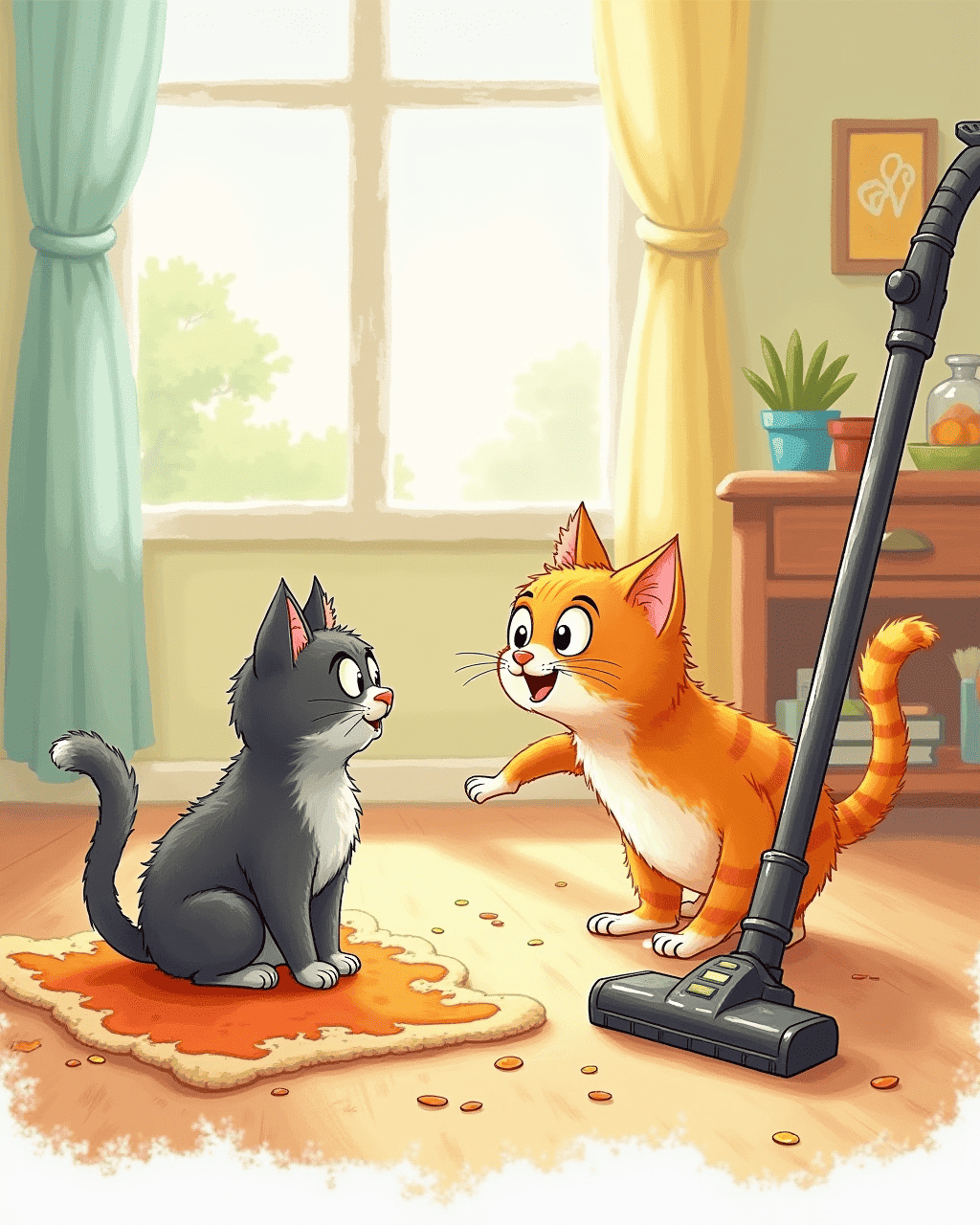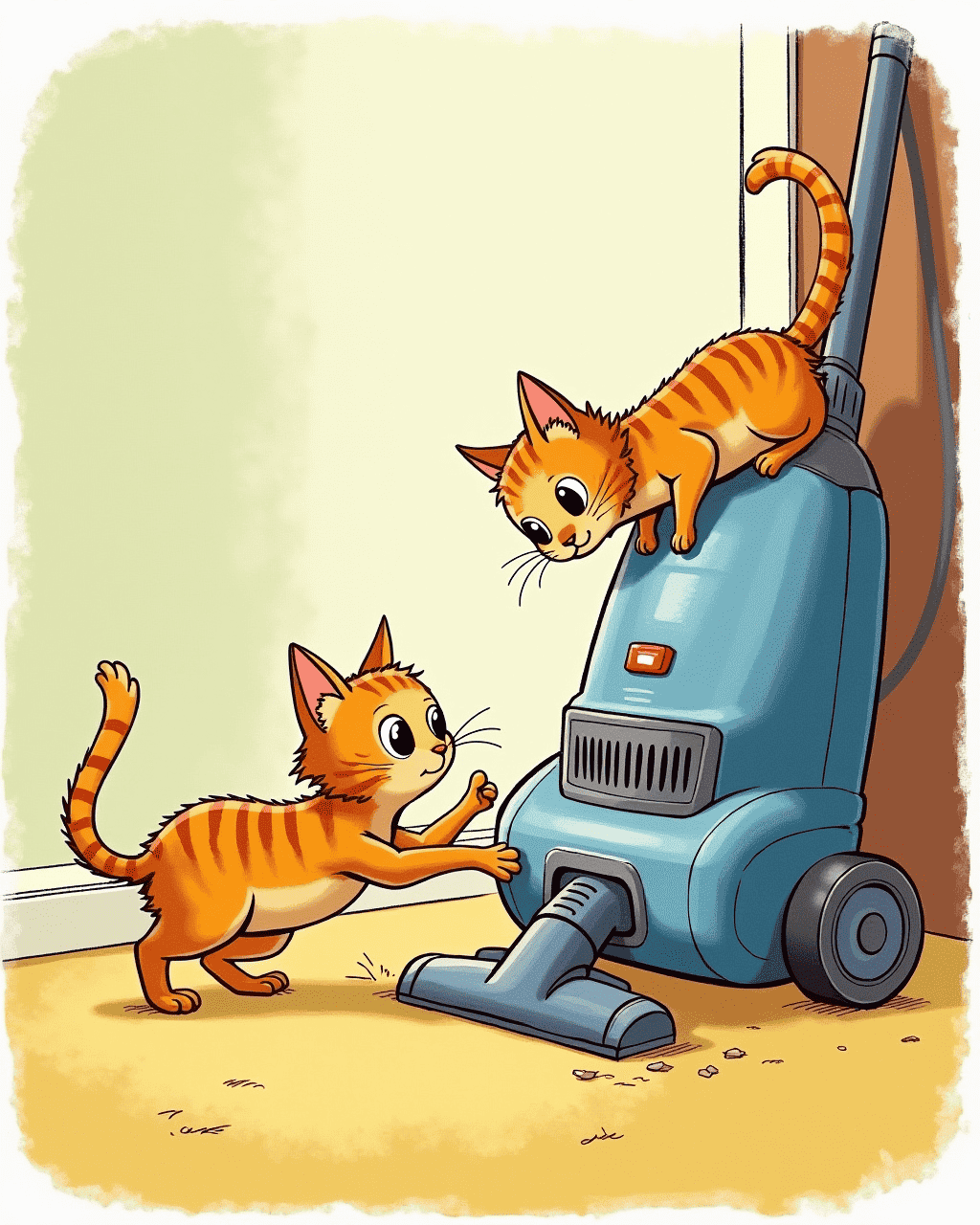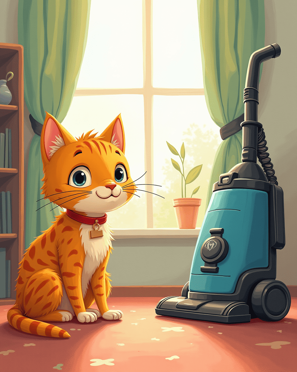 Whiskers the cat loves to explore his world. Each sunrise, he prowls the living room, seeking new sights and smells. He watches the broom dance across the floor with delight. One day, a shiny machine hums into the house. Whiskers, curious and bold, decides to investigate.