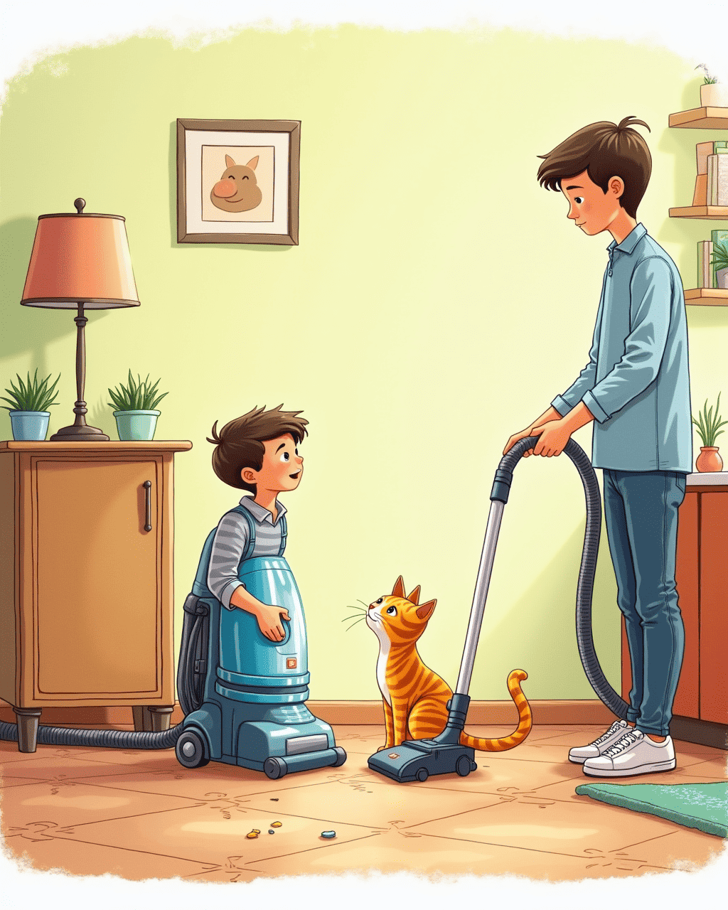 From that day, Whiskers and Vinnie guard the house together. They keep it tidy, yet they also keep each other's company. Their strange friendship teaches that friends can come in many forms. The cat no longer fears machines; he embraces them. The house feels even more homey with two friends side by side.