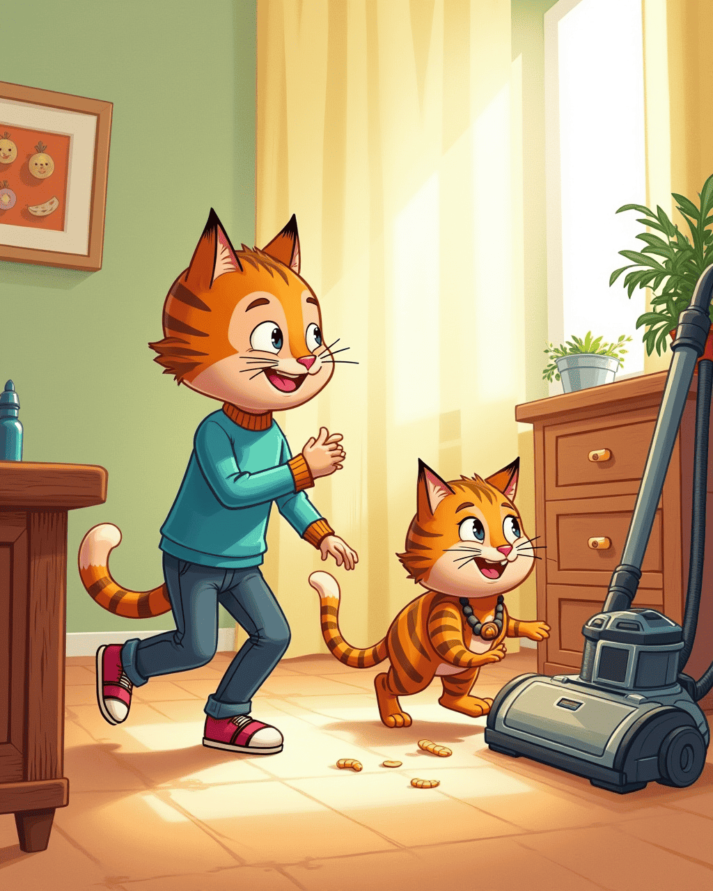 Later, Whiskers and Vinnie play a game of chase around the house. Vinnie follows the scent of a stray crumb, while the cat darts between furniture. Their playful antics light up the afternoon. The vacuum’s brush sweeps the floor while Whiskers pounces on imaginary prey. Both laugh in their own special way.