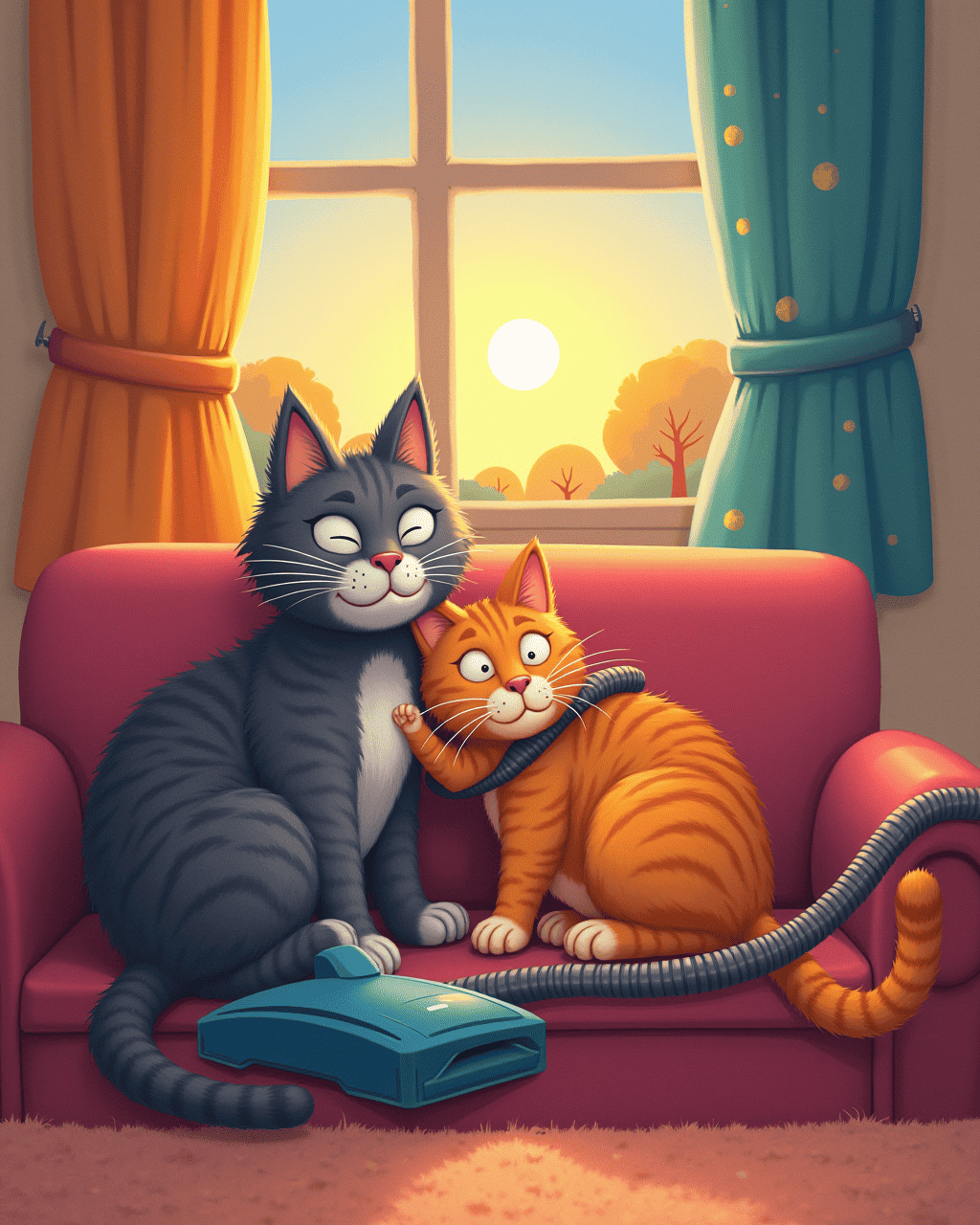When the sun sets, Whiskers curls around Vinnie's power cord, feeling safe and warm. They sit on the sofa, watching the world outside. Vinnie’s motor hums softly, like a lullaby. The cat purrs and drifts into a cozy nap beside the clean house. Their friendship is quiet but strong.