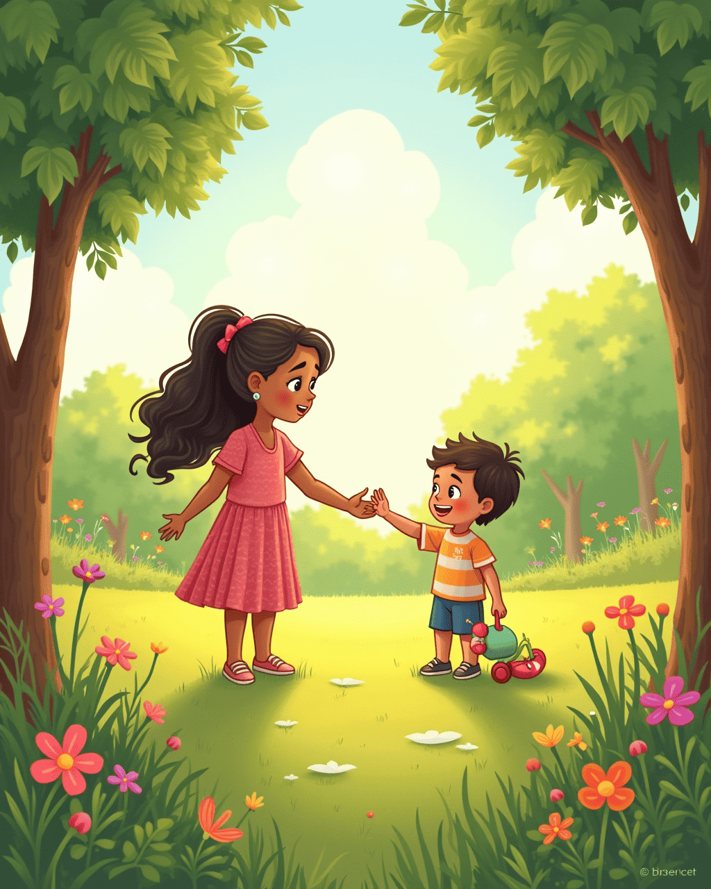At the park, Maya saw a child crying because he had lost his favorite toy. Maya offered to help search. Together they found the toy under a tree. The child's smile returned, and he thanked Maya with a high‑five. Around them, other families laughed and chatted, all feeling brighter thanks to Maya's kindness.