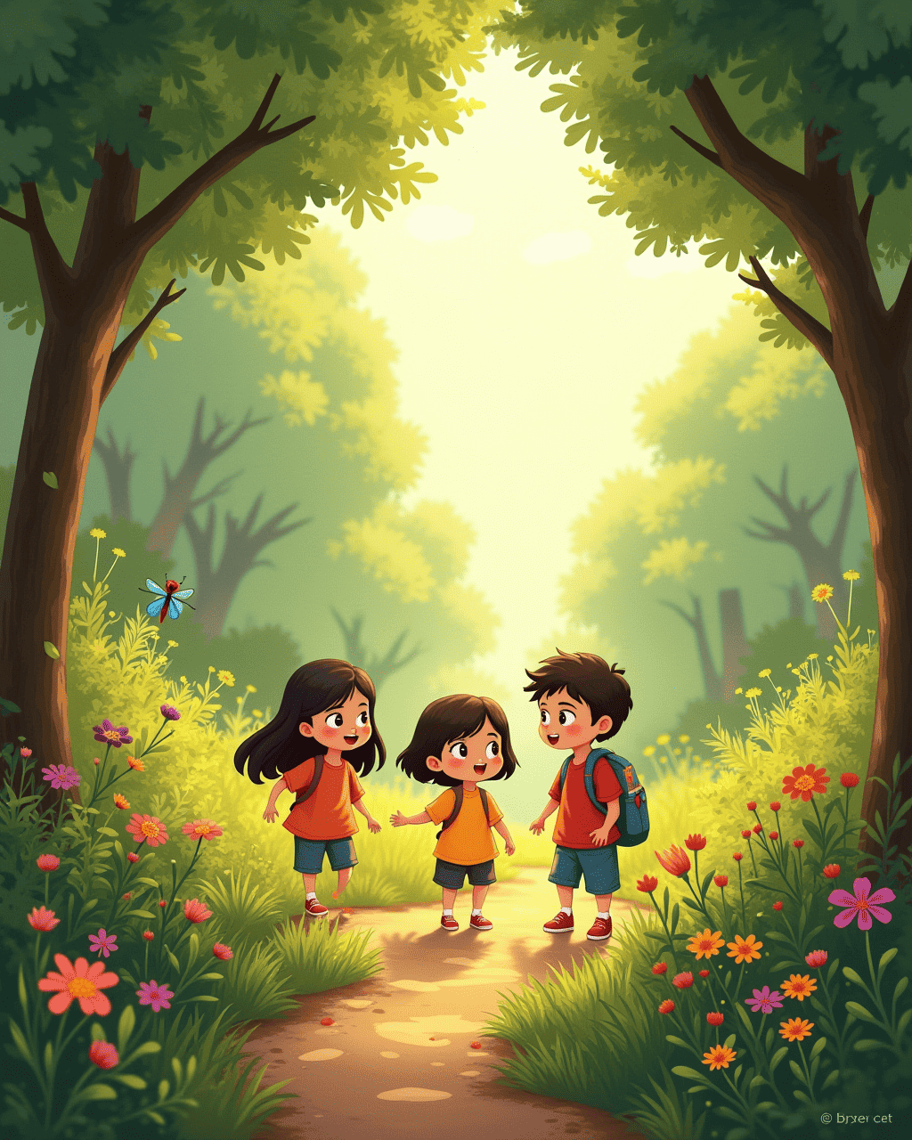 Five bright‑eyed children—Lily, Max, Mei, and Tom—spoke of the rumor that a forest full of gigantic insects awaited beyond the hill. They packed sandwiches, small lanterns, and a map drawn by an old scout. When the sun dipped behind the trees, the path shone golden, just like treasure. With a collective hop, they stepped into the unknown, their laughter echoing through the leaves. The air smelled of sweet nectar and the faint hum of wings.