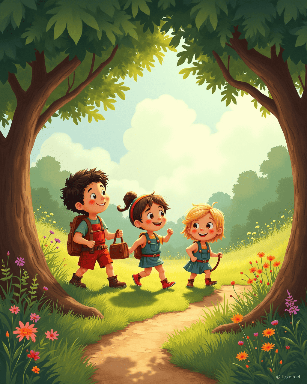 The map was filled with bright symbols and cryptic riddles. A golden key marked the entrance to the Enchanted Bridge that could only be crossed under a full moon. Milo traced the dotted line with his finger, humming a tune that made the map seem to glow. Meanwhile, Sara collected sticks and stones, preparing a small pouch for supplies. Lily, ever the organizer, checked that everyone had their backpacks filled with water, snacks, and, most importantly, courage.