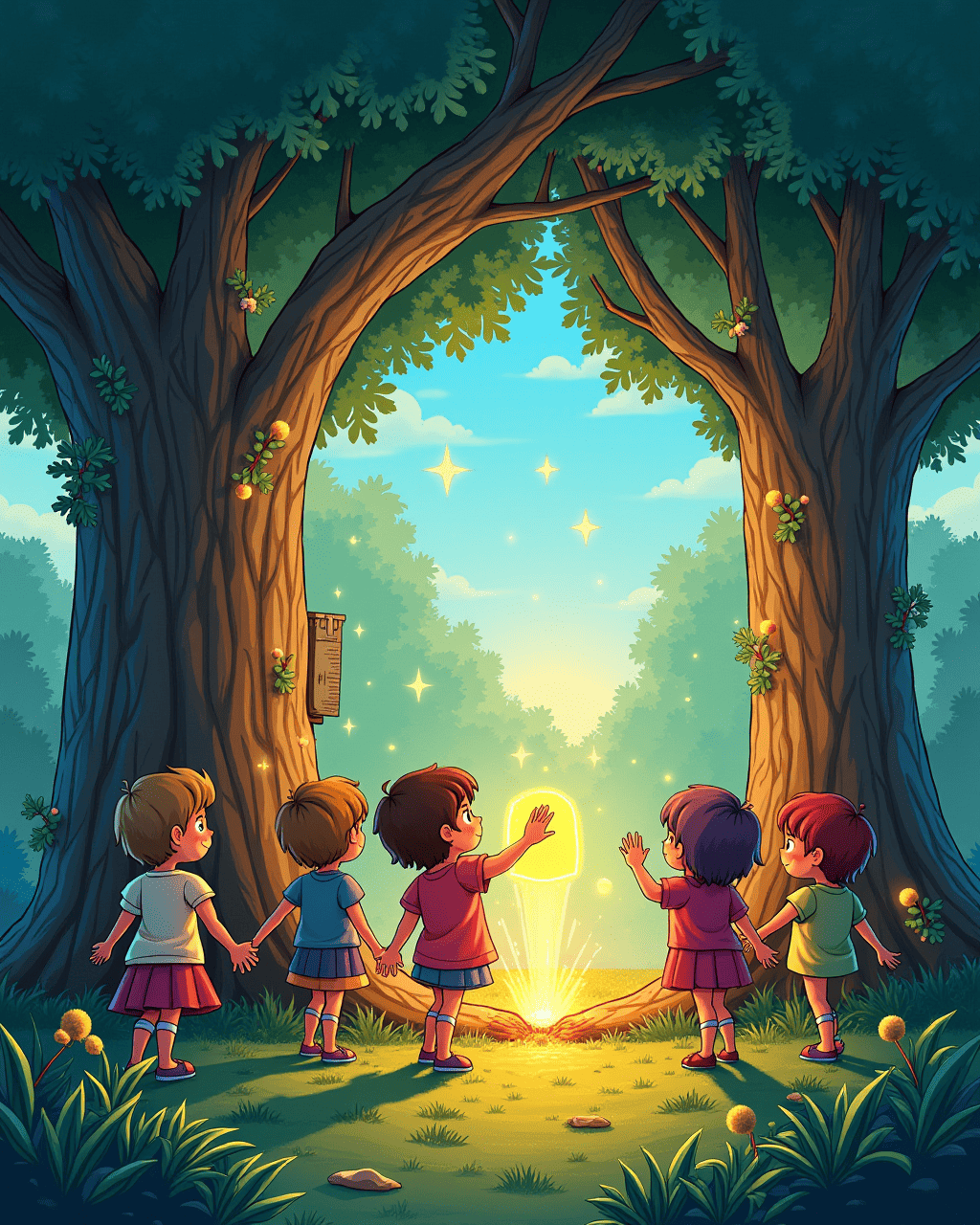 The children gathered around the old oak tree. They found a large mirror hidden behind twigs. The glass shimmered with bright colors. When they touched it, a warm light wrapped around them. They stepped forward and felt a gentle pull.