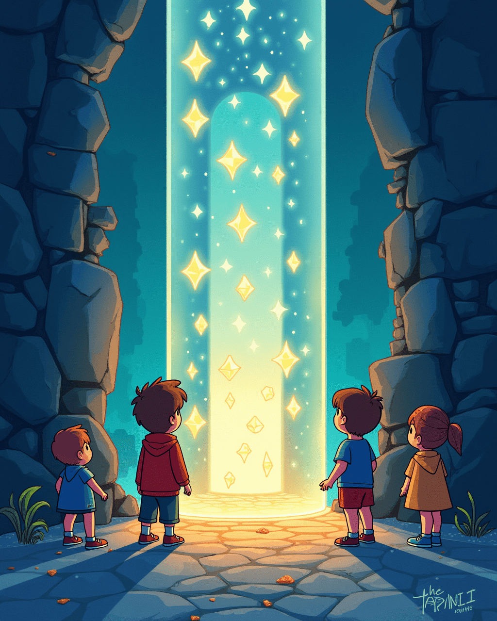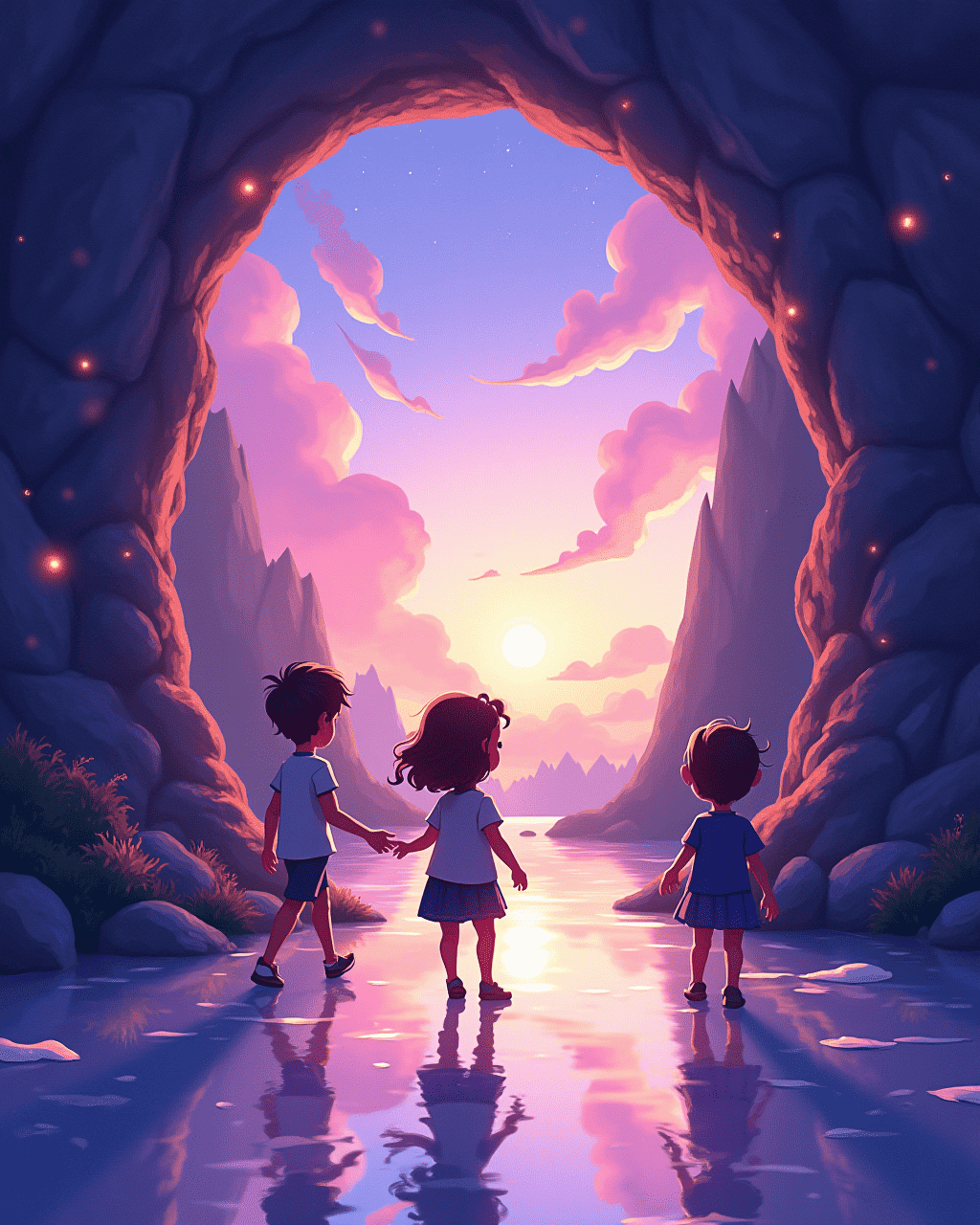 A grand glass tower stood before them. In it lay a puzzle that opened the gateway. The children solved it by arranging glowing stones. The wall slid shut, revealing a bright exit door. They felt a sense of achievement and adventure.