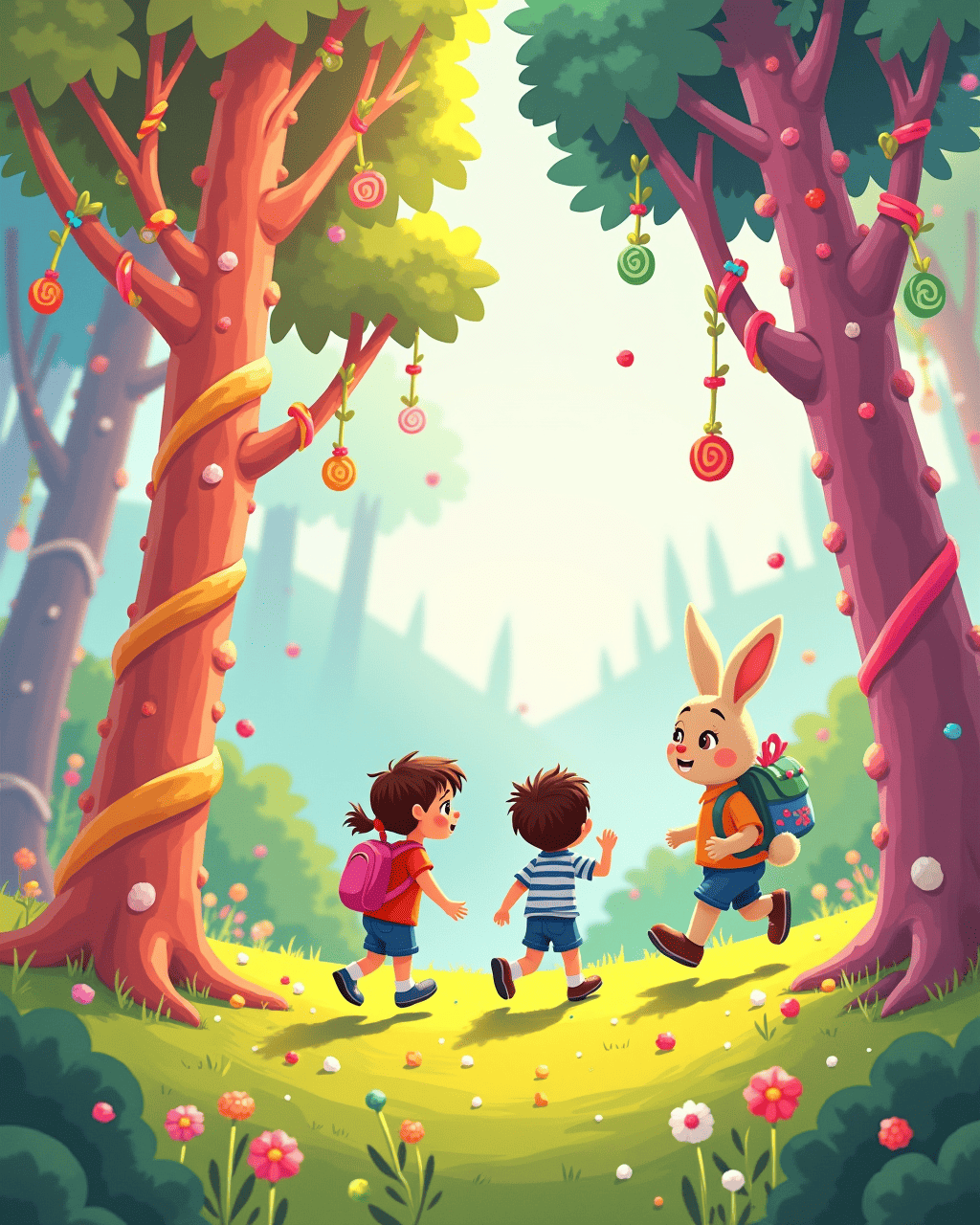 The forest was made of giant candy trees. Lollipop vines hung from the branches. A friendly rabbit with a backpack hopped beside them. The rabbit welcomed them to play in the Meadow of Giggles. The children giggled and ran across the soft rainbow grass.