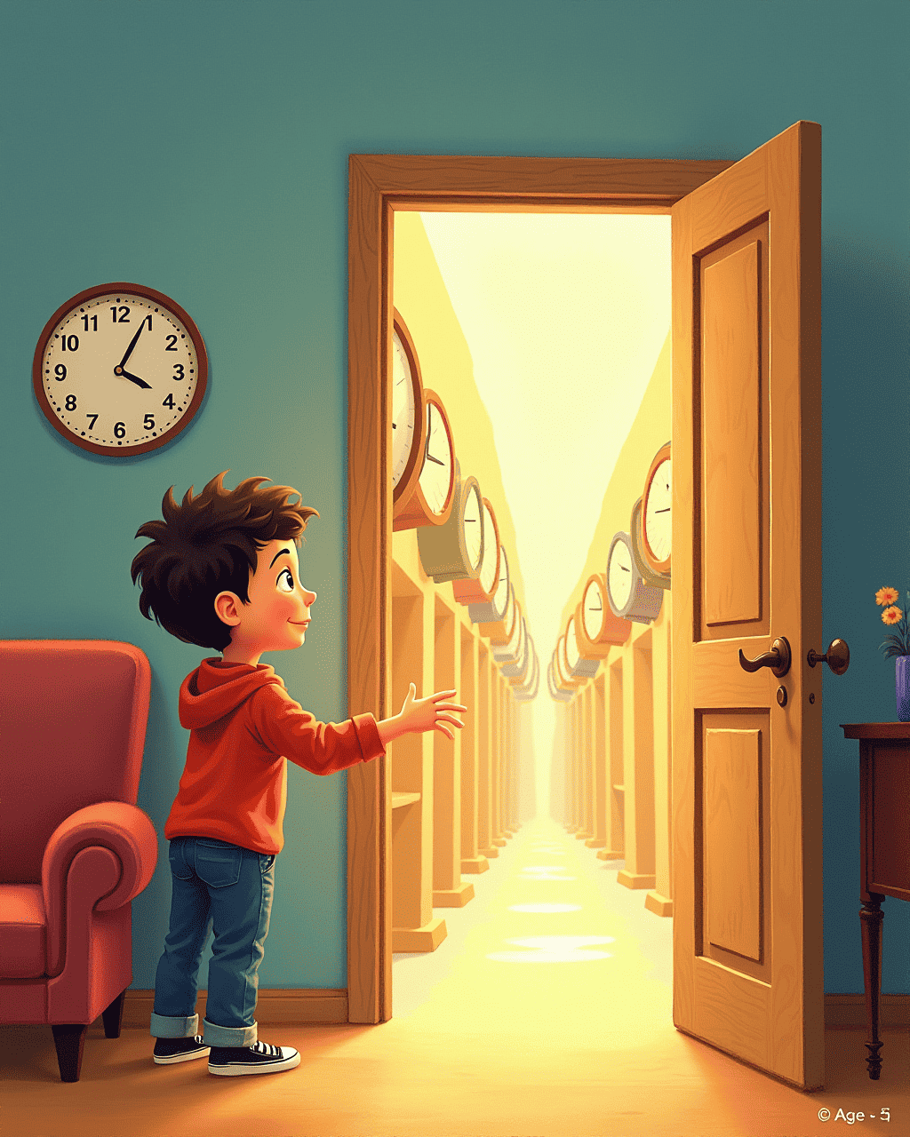 When the clock stopped, a tiny door appeared behind the sofa. Tommy reached inside and felt a cool breeze. The door led to a bright hallway lined with clocks. Each clock had a different face and color. He felt a spark of adventure.