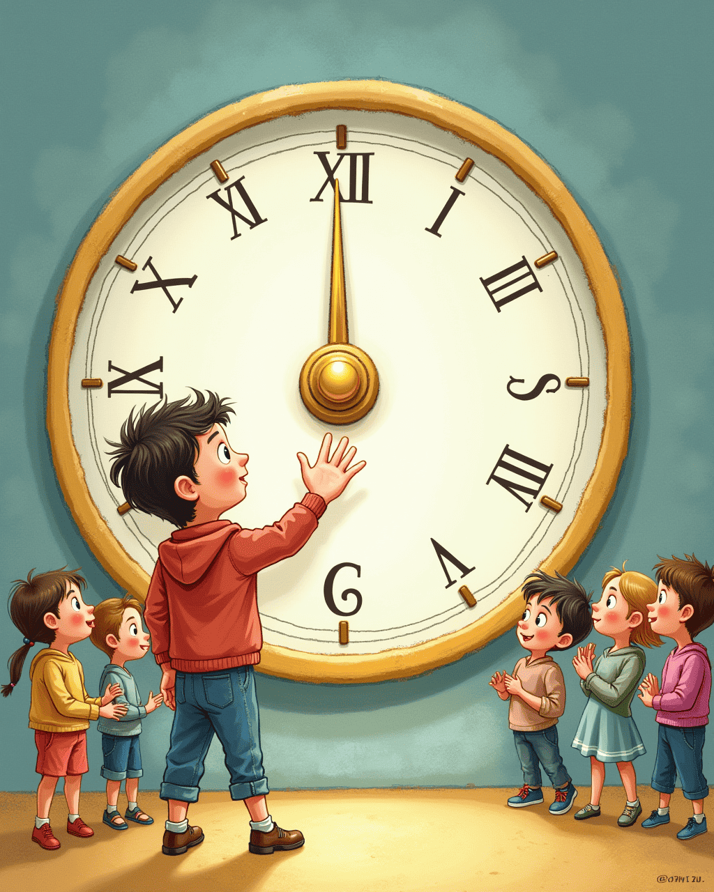 In the hallway, the big clock’s face had a shiny button. Tommy pushed it and watched the world freeze. Children were mid‑jump, birds stayed in mid‑flight. Tommy felt the weight of stopping time for everyone. He promised himself to use it wisely.