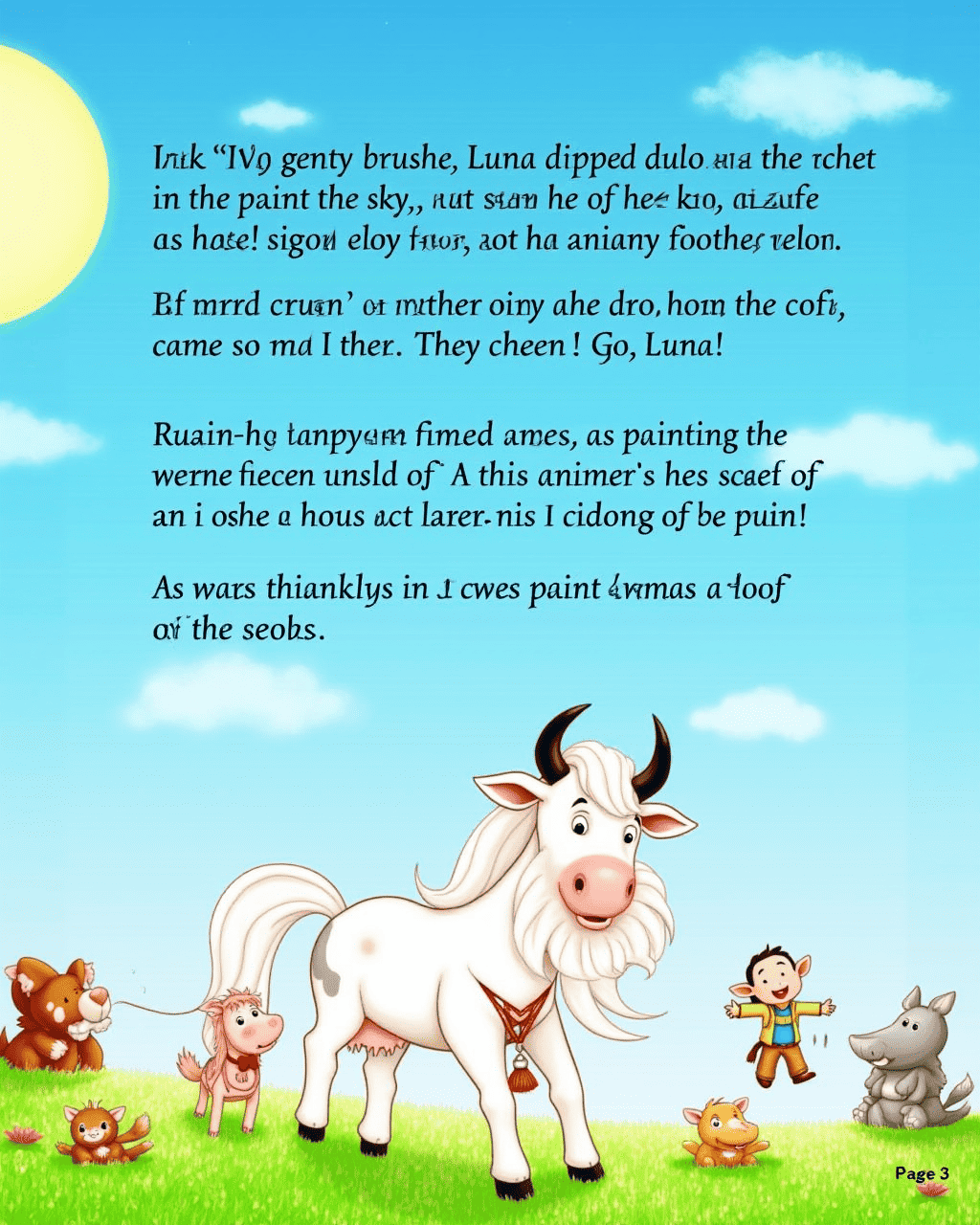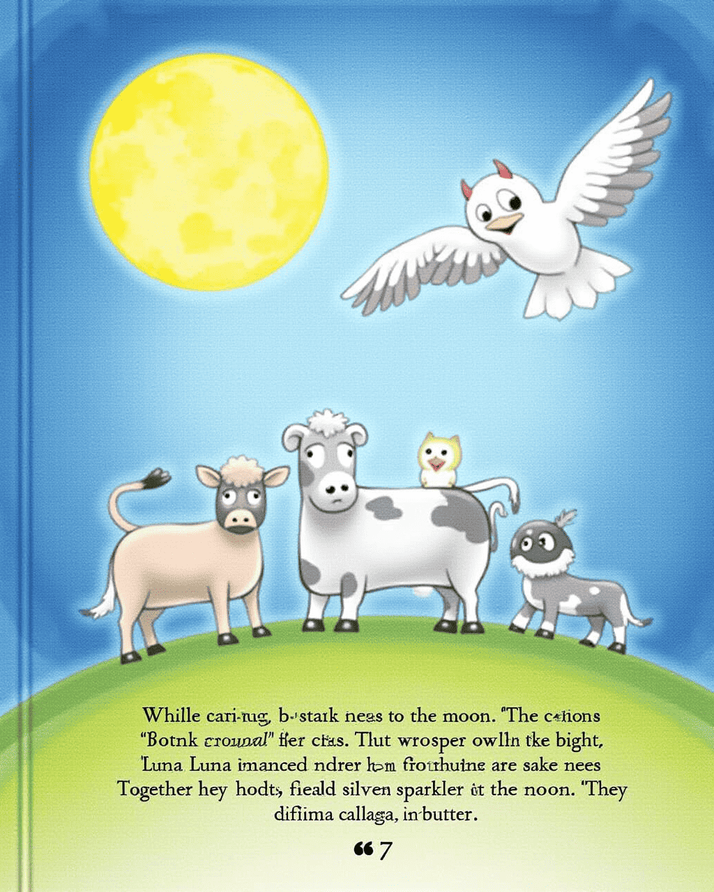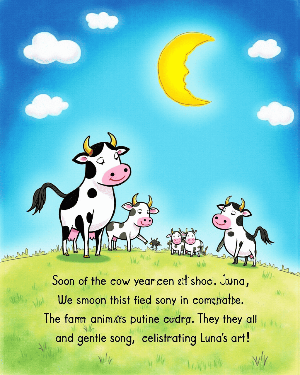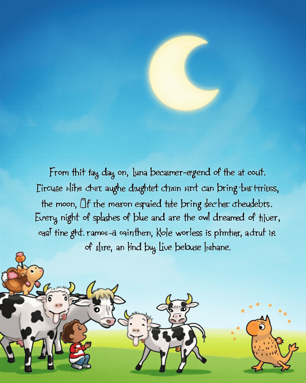 From that day on, Luna became a legend. The moon taught everyone that art can bring friends together. Every night, the moon reflected her colors. The cows dreamed of splashes of blue, and the owl dreamed of silver. And all lived happily, painting the sky with love.