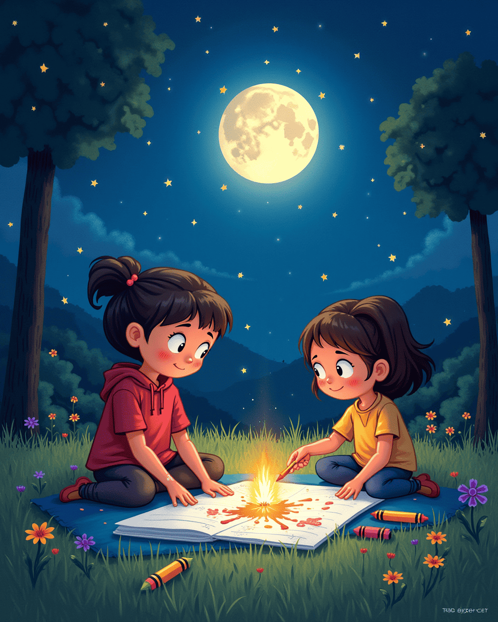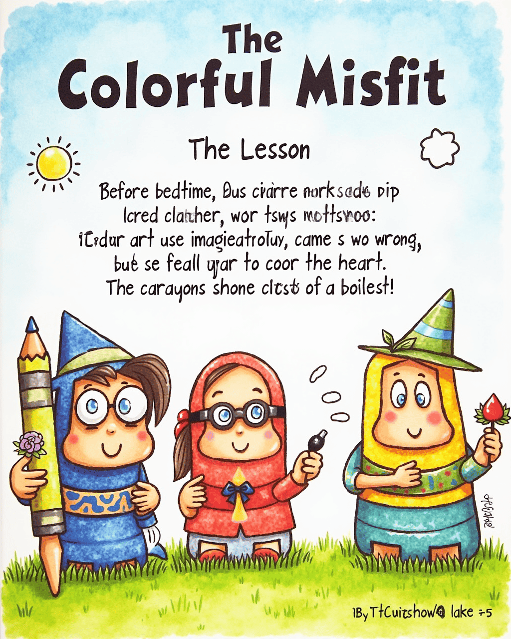 Before bedtime, the child closed the book, and the crayons rested. The teacher, a wise old pencil, came and spoke: "When art uses imagination, there is no wrong line." The kids listened, learning not to fear the lines, but to color the heart. The crayons celebrated, and Crimson shone the brightest.