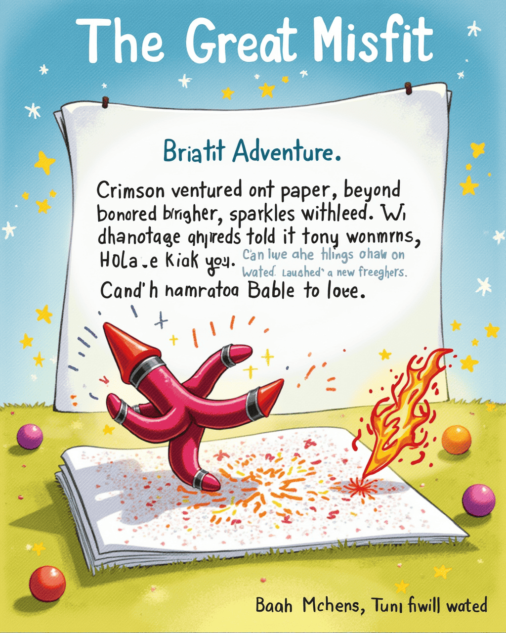 Once upon a time in a bright box of crayons, a new shade named Crimson stared at the sketchbook. The paper had neat, tidy lines that glowed with promise. Crimson felt the urge to splash colors beyond those borders. The other crayons whispered, "Remember, little one, no smears." Crimson smiled, deciding it would color wherever it wanted.