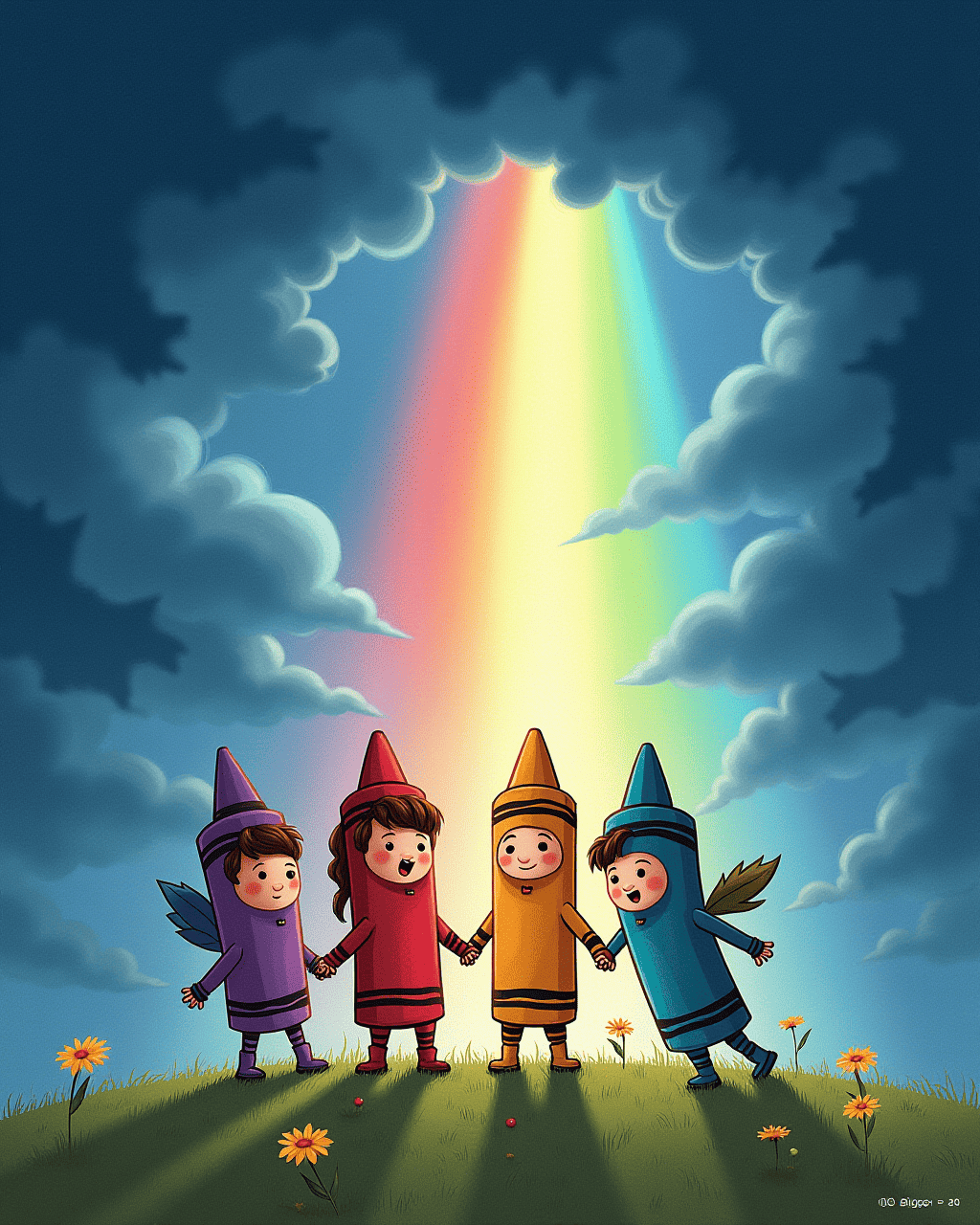 When the next drawing came, all crayons joined hand in hand. The crayons no longer worried about staying inside the lines. They all drew together, mixing colors and letting imagination guide them. The story ends with a bright rainbow that shows that being true to yourself brings joy.
