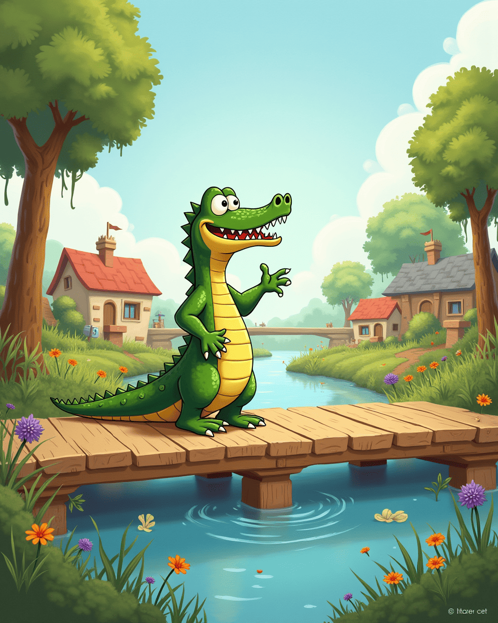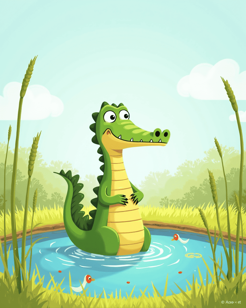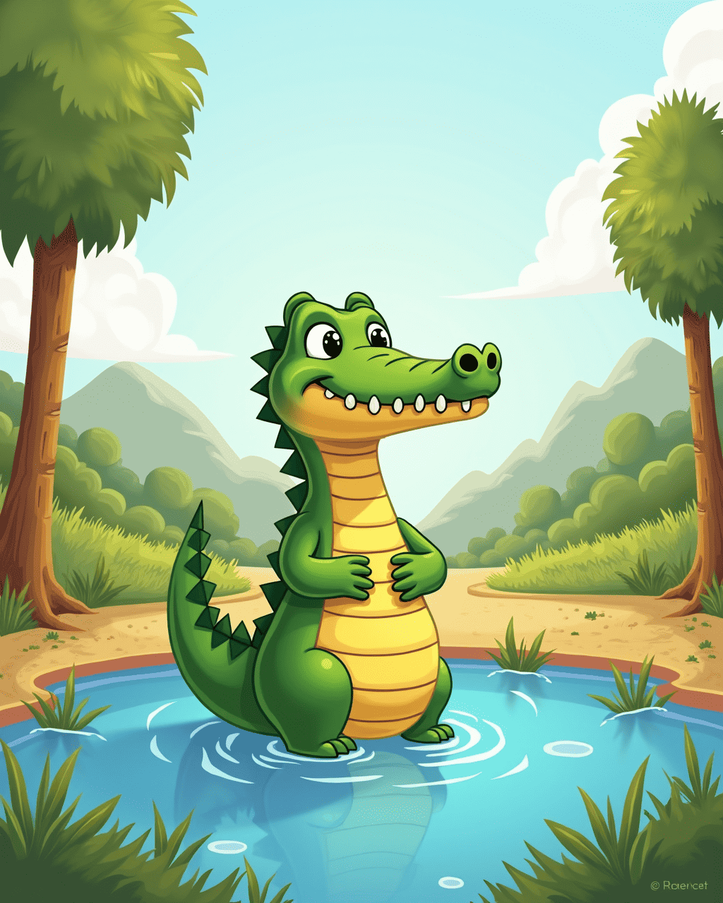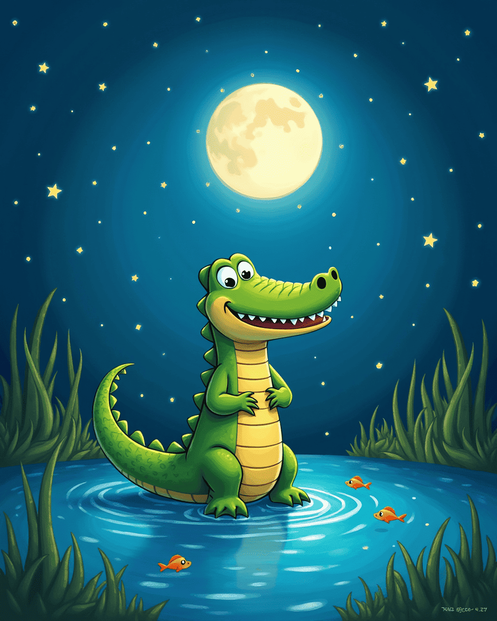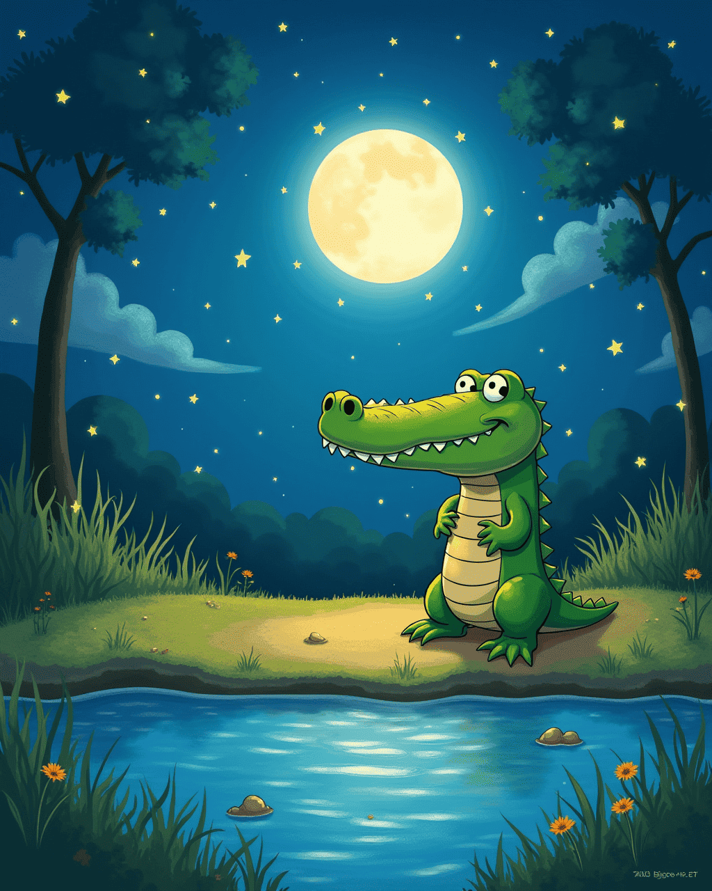 Leo the Crocodile lived in a shallow river near a bustling town. He loved watching the villagers dance and sing under the bright sun. One day, the mayor announced a talent show for all the river creatures. Leo felt a flutter in his stomach as he imagined stepping onto the stage. He tried to hide his nerves behind a big grin, but his heart beat like a drum. The day before the show, he practiced humming by the water.