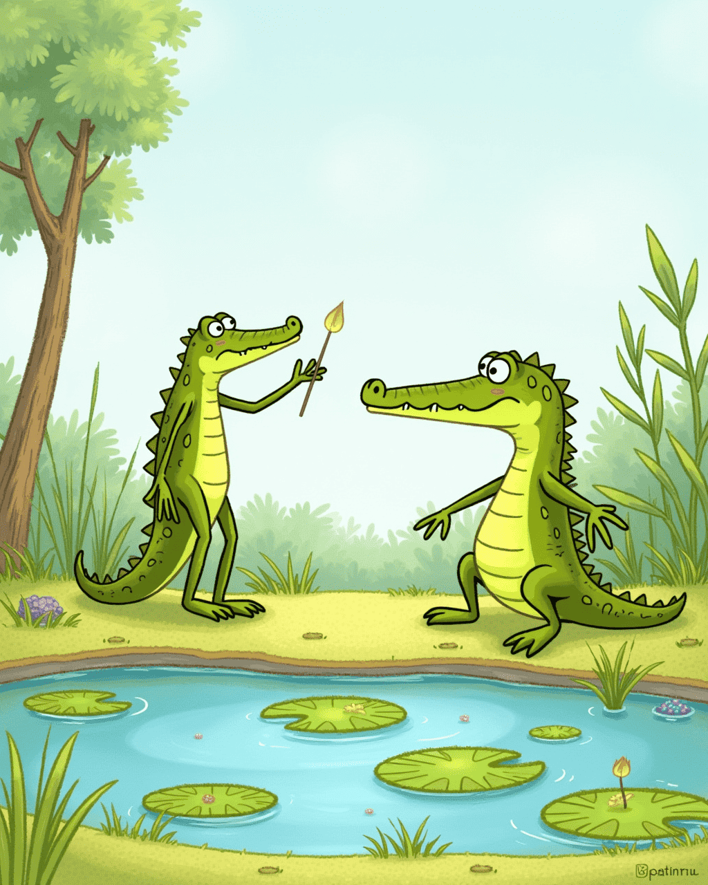Near the lily pads, a small frog named Mr. Kermit offered to help. He taught Leo simple breathing exercises. "Take a deep breath, Leo," Mr. Kermit croaked. The crocodile relaxed his jaw and inhaled slowly. He felt a lightness in his throat. Then Mr. Kermit added, "Remember, every good performer is just a beginner at first."