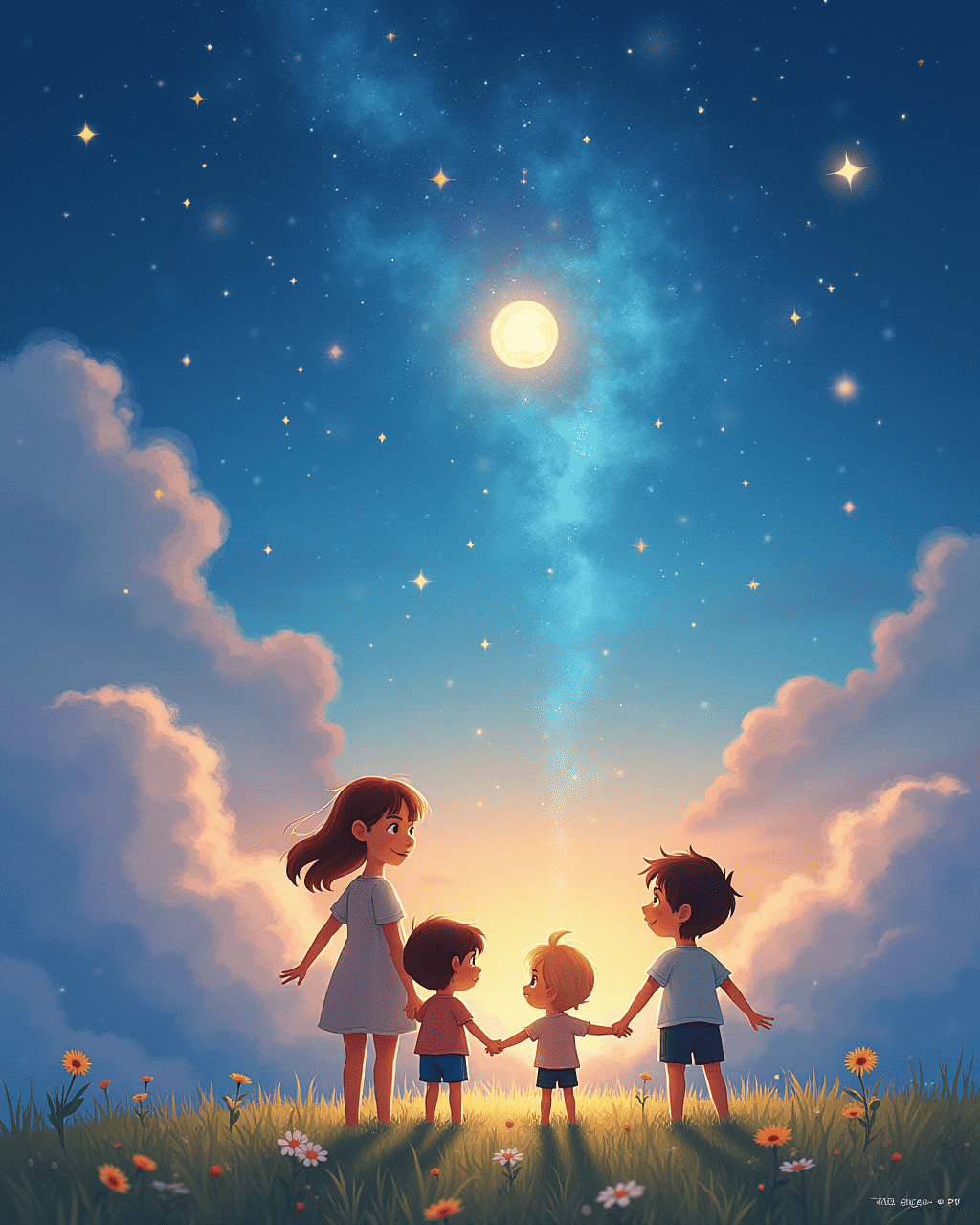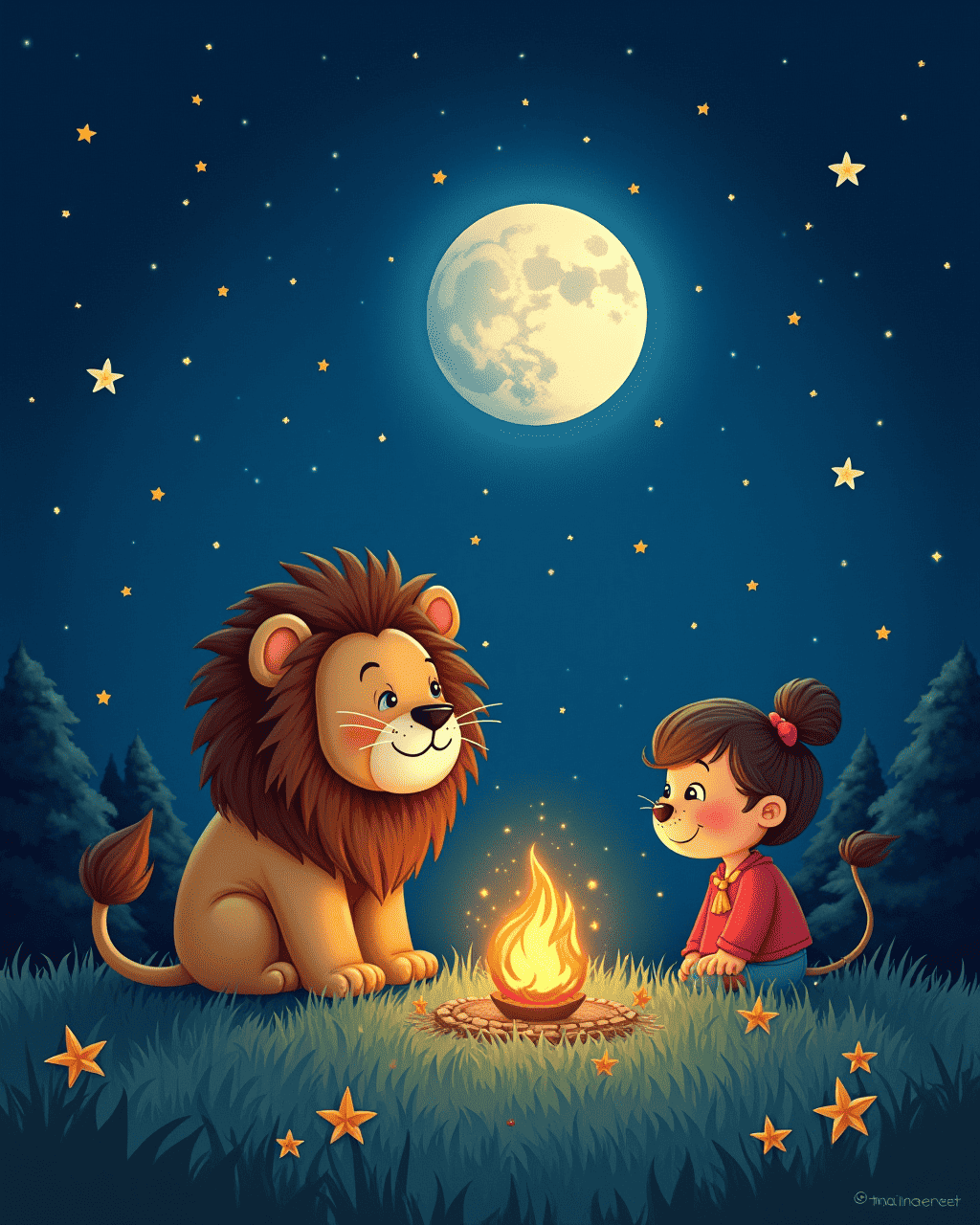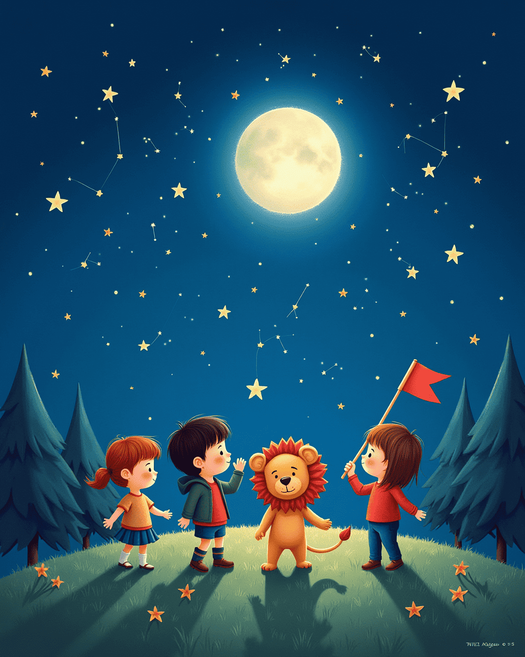 The crew gathered under a velvet sky. Leo the Lion was the leader. Luna the Moon made a gentle glow. They asked the stars to share stories. Each star whispered bright secrets.