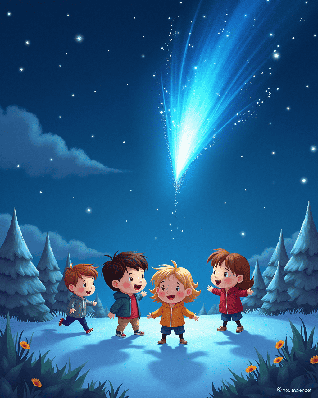 The Blue Comet glowed ahead. Milo the Meteor guided them. They chased its icy trail. The comet sang a cool tune. Their curiosity burst like fireworks.