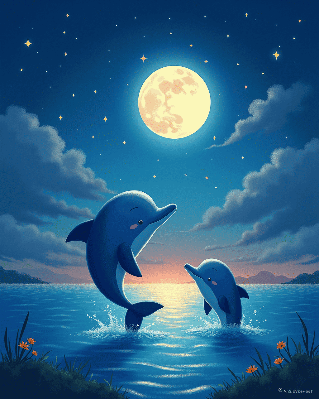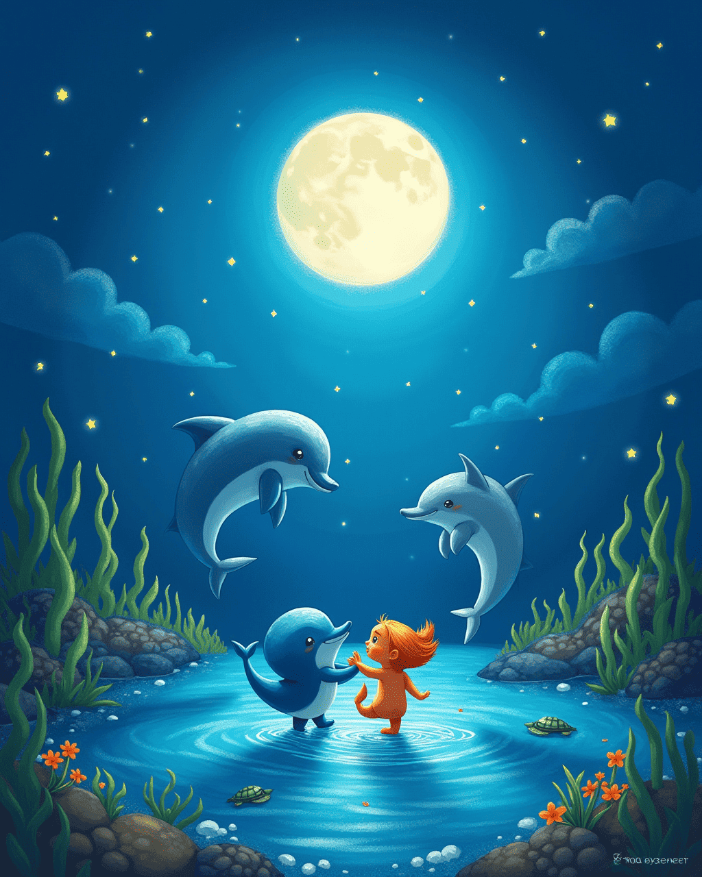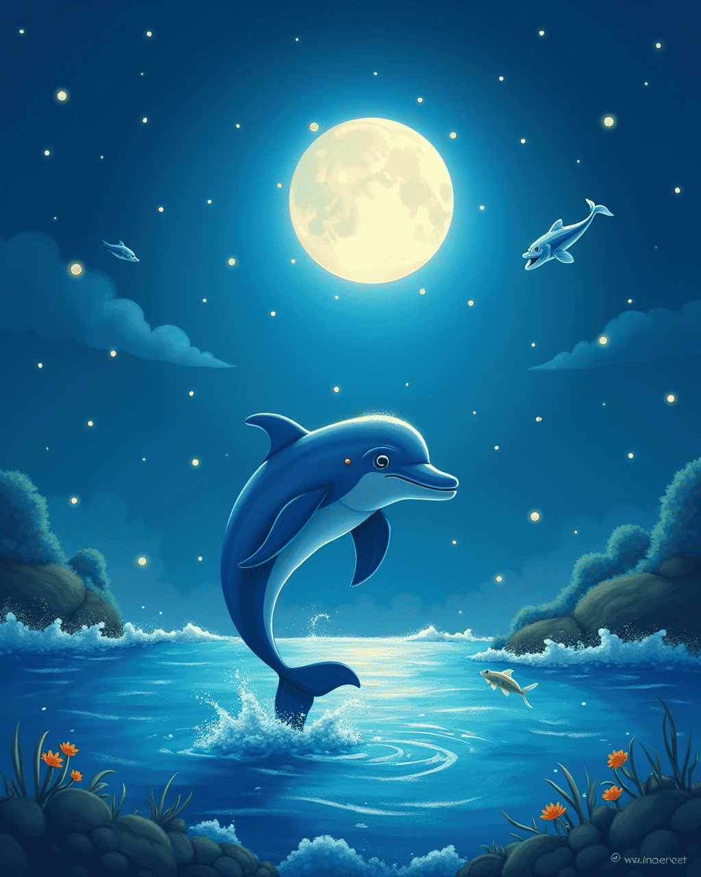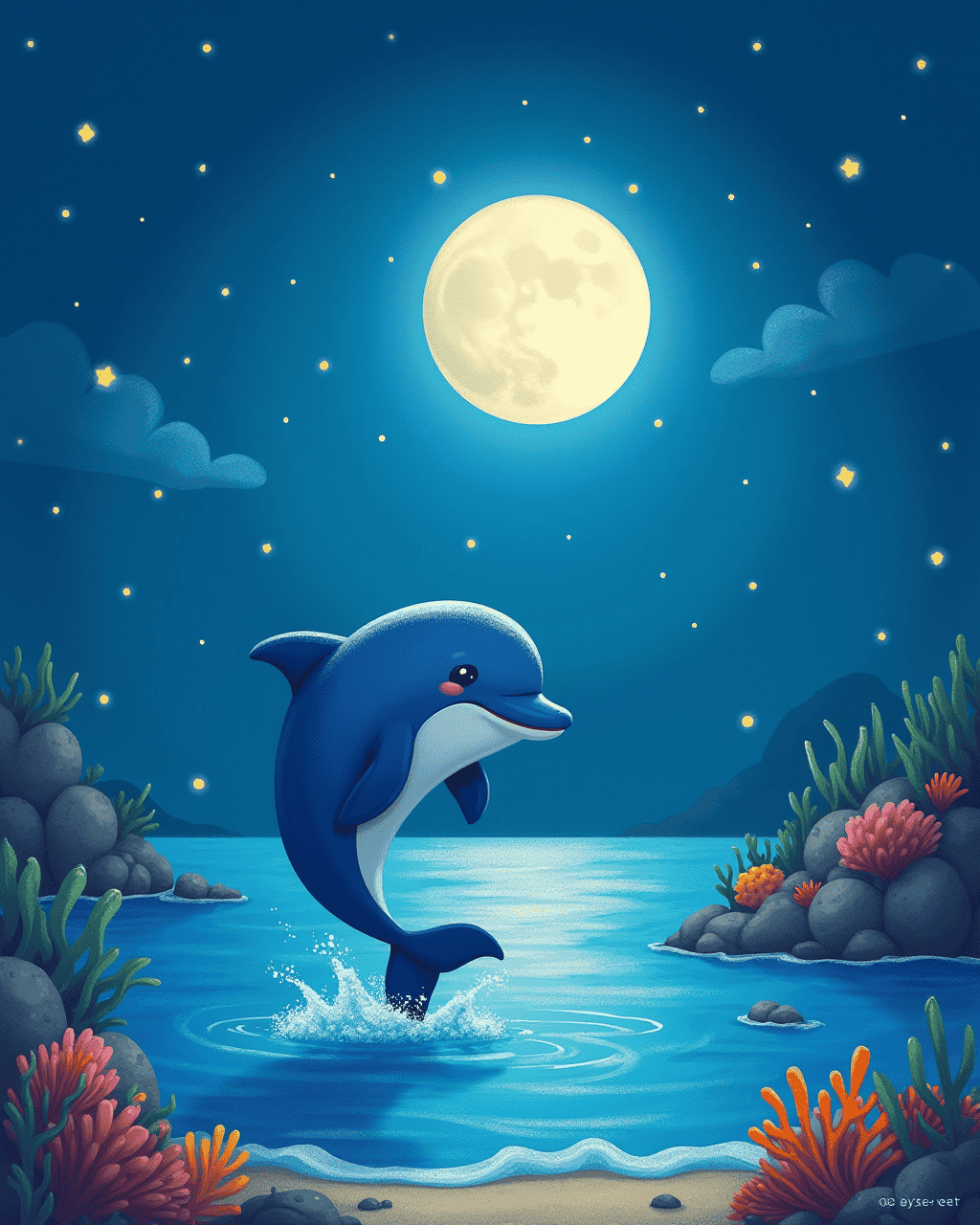 When the moon dipped low over the tide, Pip the dolphin swam excitedly, his heart full of adventure. He could feel the cool water brushing his shiny skin as he splashed beside the gentle waves. Pip shouted a happy splashy sound, hoping someone would notice his excitement. The sea creatures watched from the coral beds, twinkling like tiny stars. The evening promised a new story for Pip's playful heart.