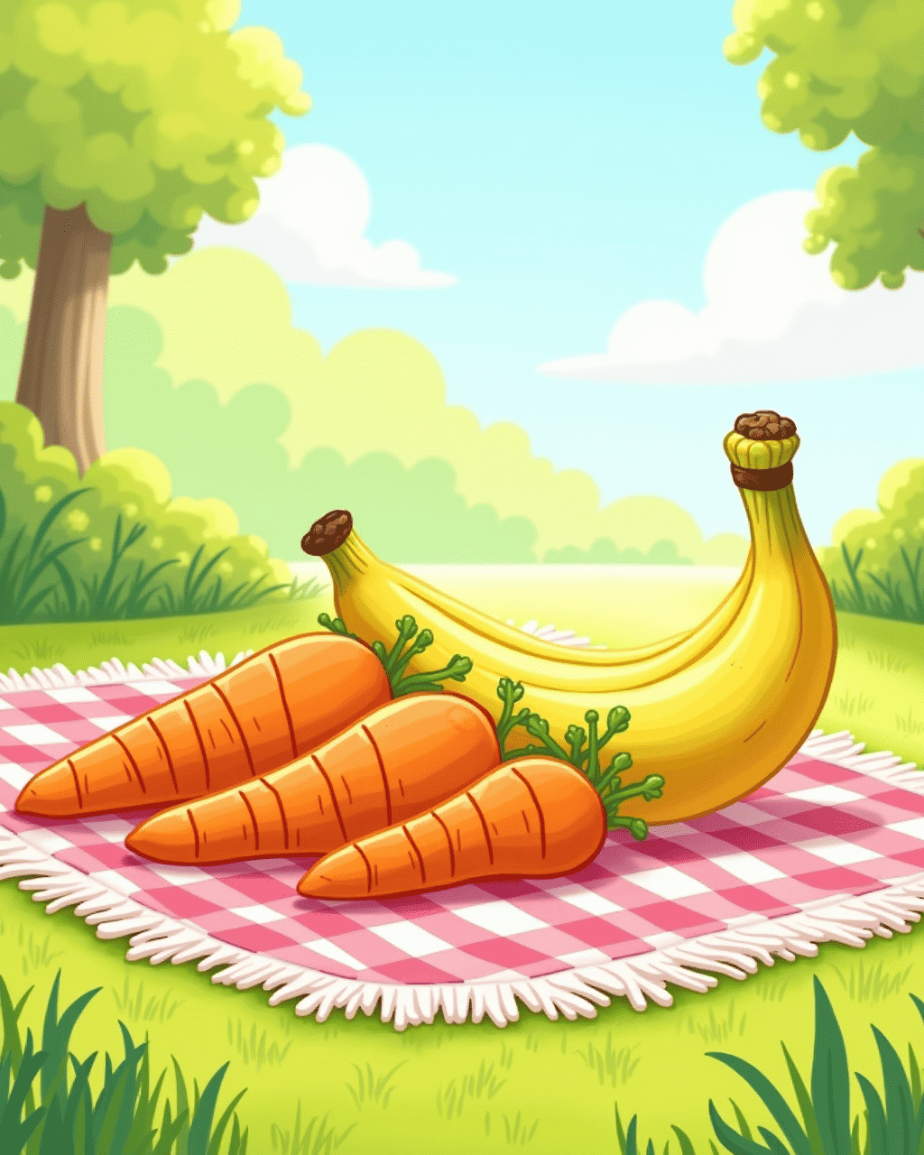 At the park, the crunchy carrots jumped onto the picnic blanket. They squealed with delight when a breeze kissed their tops. The banana was the star who sang a sweet, mellow tune. Together, they formed a band of cheerful fruits and vegetables. The children clapped, and the snack time became a festival of flavors.