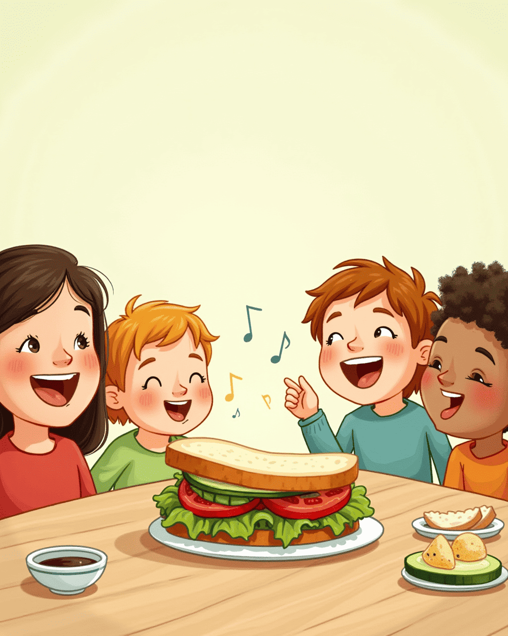 At the lunch table, the sandwich hummed a gentle tune. The lettuce spun joyfully around the cucumber, dancing to the rhythm of the sandwich. The tomato blushed with a bright red cheer and sang with gusto. The kids giggled as each bite felt like a melody. The lunch became a harmonious gathering, full of laughter and delicious notes.