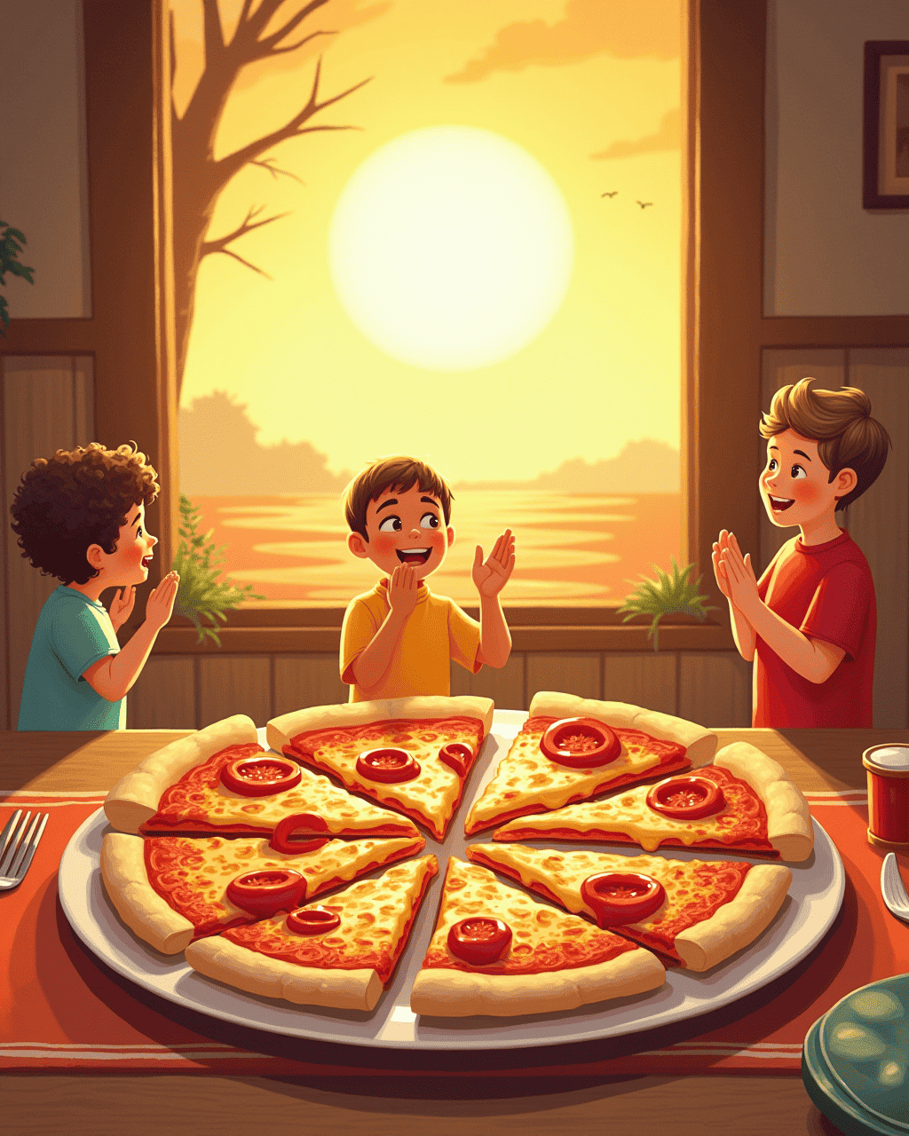 As the sun set, the pizza slices strutted onto the plate. The cheese sang a long, melty solo that filled the kitchen. The tomato sauce harmonized with the peppercorn’s rhythmic tap. The kids laughed as the crust crackled like applause. The evening feast became a beautiful dinner show, leaving a sweet aftertaste in everyone’s hearts.