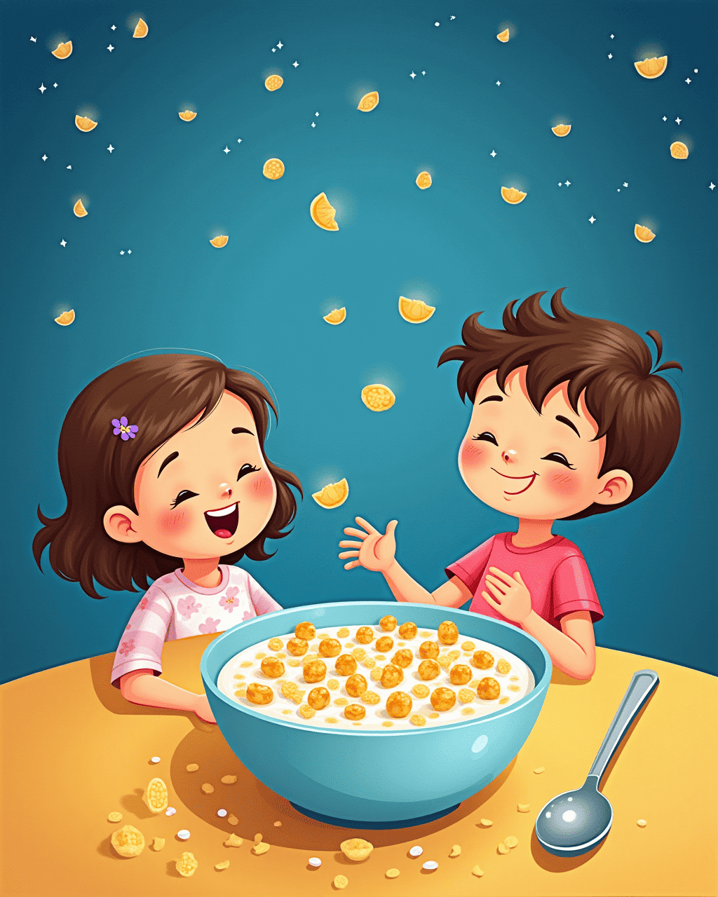 Before bed, the cereal rumbled softly in the bowl. The milk swirled around the grains, creating a gentle waltz. The spoon played a silent drum that kept the rhythm steady. The children drifted into sleepy smiles, feeling happy and safe. The night snack became a quiet lullaby, sending everyone into a peaceful slumber.