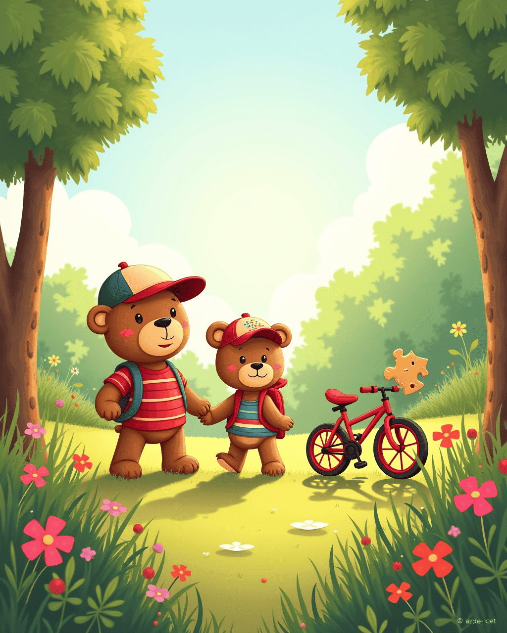 We watched from the window as they waddled into the garden, each toy with a different hat. The teddy bear wore a baseball cap, the bicycle had a small backpack, and the puzzle pieces carried a map of the backyard maze. They reached the garden's edge and shouted, "Let the vacation begin!" while the wind carried their laughter up to the clouds.
