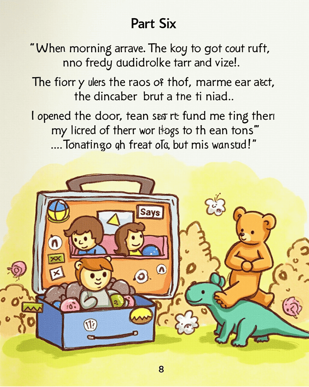 When morning arrived, the toys returned to the closet with their suitcases now empty. The teddy bear hugged me, the dinosaur bowed, and the marble rolled into a neat pile. I opened the door and found my toys already waiting, a tiny note on top of their pile that said, "Vacation was great, but we miss you!"
