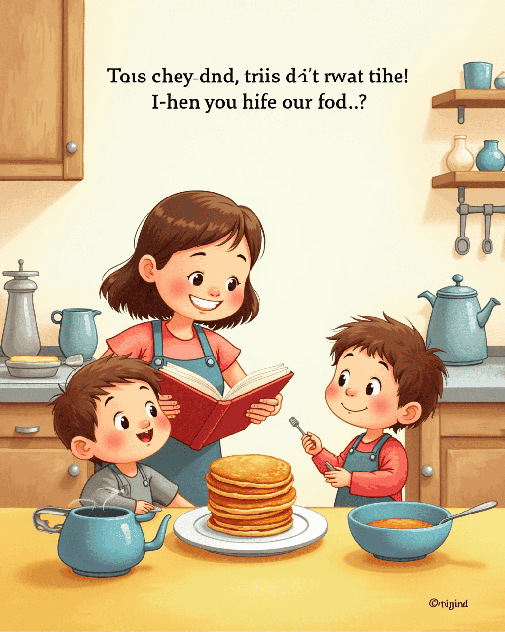 Dad walked into the kitchen with a bright smile, holding a cookbook that smelled like adventure. He opened the first page and pointed to a picture of pancakes. He whispered, "This will be the most special breakfast ever." Mom sighed, but she was curious. The whole family gathered around, ready for the surprise.