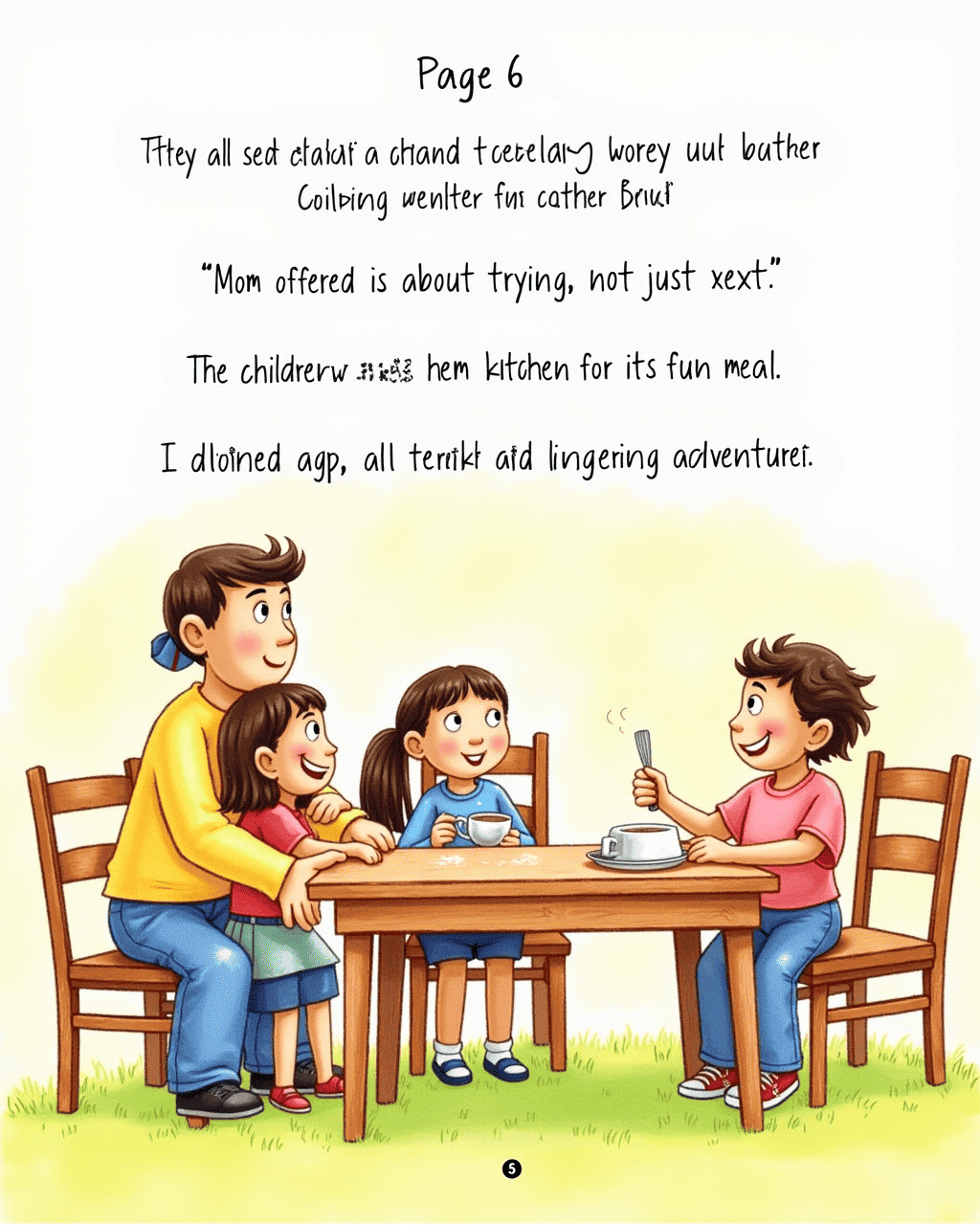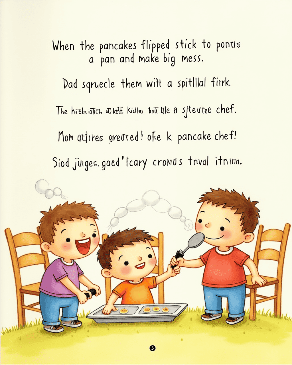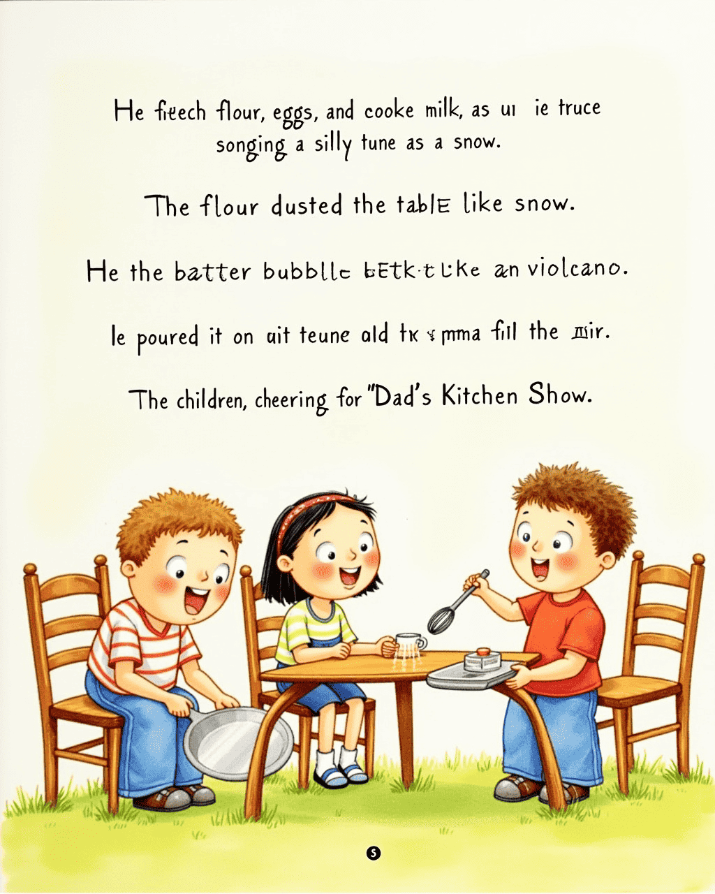 He fetched flour, eggs, and a splash of milk, singing a silly tune as he went. The flour dusted the table like snow. He whisked the mixture; the batter bubbled like a tiny volcano. He poured it onto the pan, and the aroma filled the air. The children clapped, cheering for "Dad's Kitchen Show."