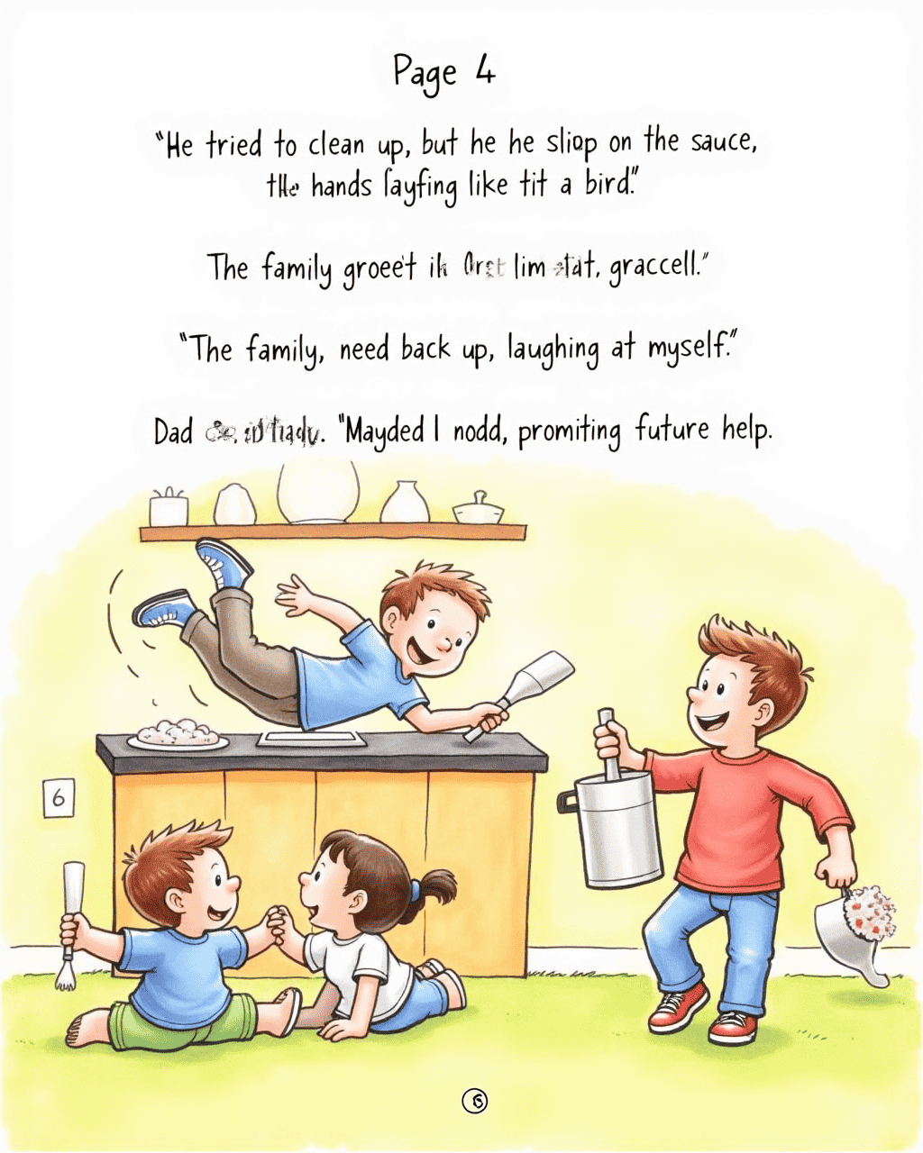 He tried to clean up, but he slipped on the sauce, sliding across the counter. He fell gracefully, hands flapping like a bird. The family cheered as he got back up, laughing at himself. Dad said, "Maybe I need practice." The children nodded, promising future help.