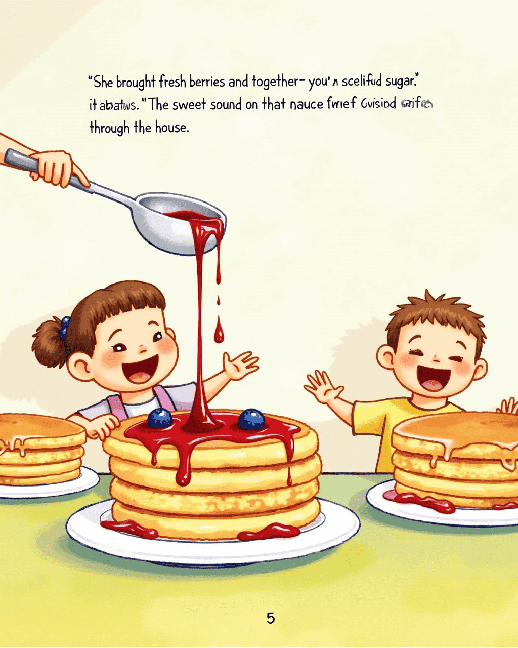 She brought fresh berries and sugar, and together they stirred a colorful topping. The sauce bubbled, giving a sweet sound that echoed through the house. They served the pancakes flat on white plates, the syrup shining. The family tasted and smiled, feeling warm happiness. Dad thanked everyone, proud of his attempt.