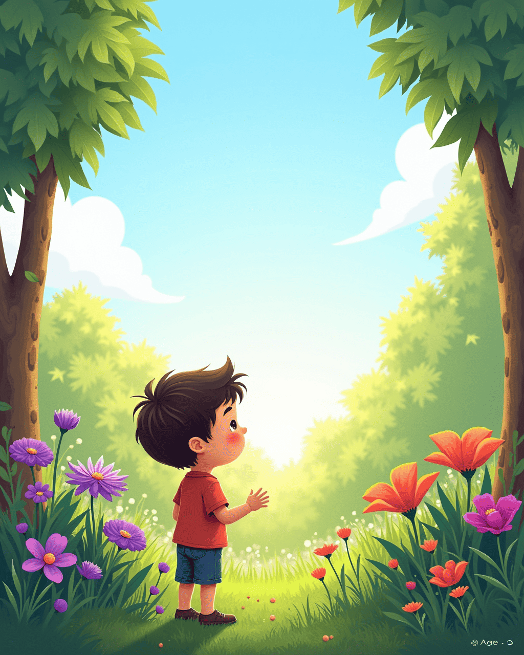 The morning sky was bright blue as usual. A little boy named Milo woke up with a smile. He looked out the window to see his garden. The flowers were blooming. He felt a sense of excitement.