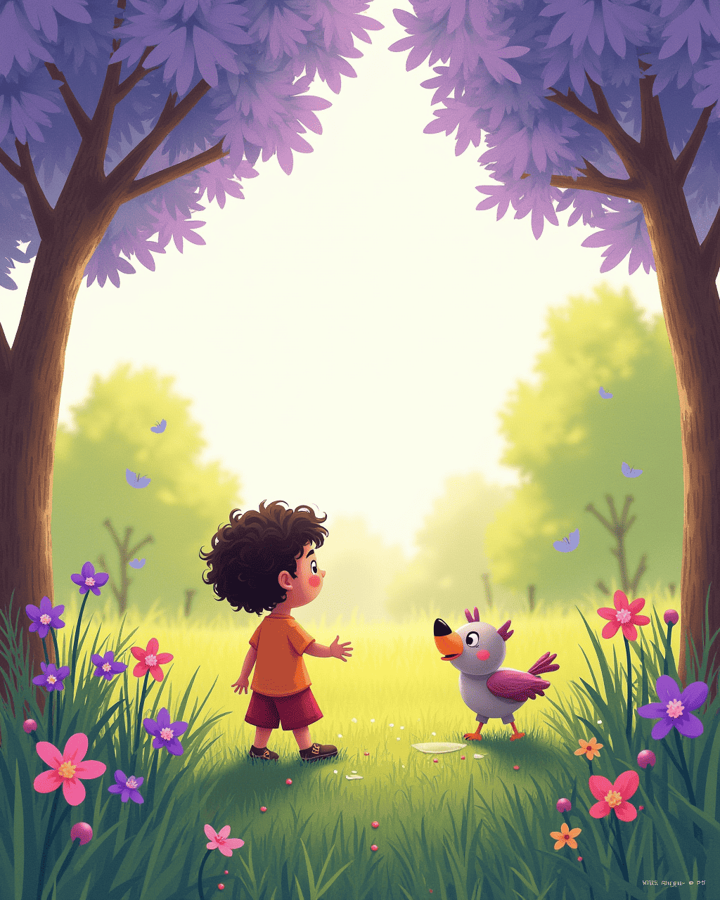 While Milo was walking to the park, the grass turned a soft violet shade. Milo touched it and laughed. The birds chirped a new melody. The leaves on the trees became lavender. Everyone felt curious.