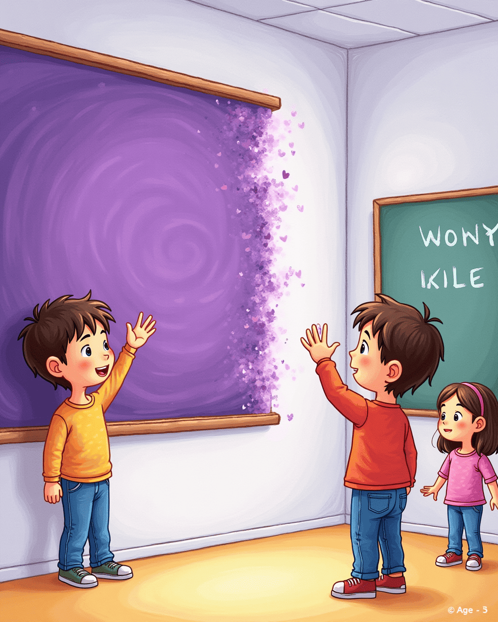 At the school, the chalkboard turned deep purple. The teacher explained how colors change. Milo raised his hand. She showed how light mixes colors. Kids wondered what would happen next.