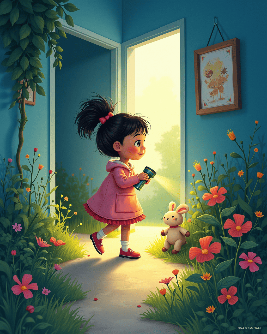 Lily walked through the dim hallway, using her flashlight to check every corner. The house seemed quiet, but she heard whispers of wind in the trees outside. She found a small, cozy spot under the stairs that felt like a secret cave. She laid the bunny beside her and whispered, “I’m safe.” Her heart was pounding, but she felt proud for taking the first step toward brave sleeping.