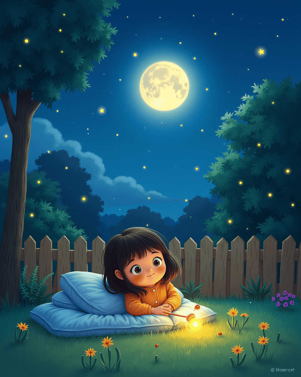 At midnight, the backyard filled with gentle sounds. Fireflies danced like tiny lanterns, and crickets played a steady song. Lily closed her eyes, thinking of the fireflies' shimmer as a guide. Her flashlight buzzed softly, keeping her from seeing the shadows that once made her fear. She felt a gentle warmth, as if the fireflies were hugging her.