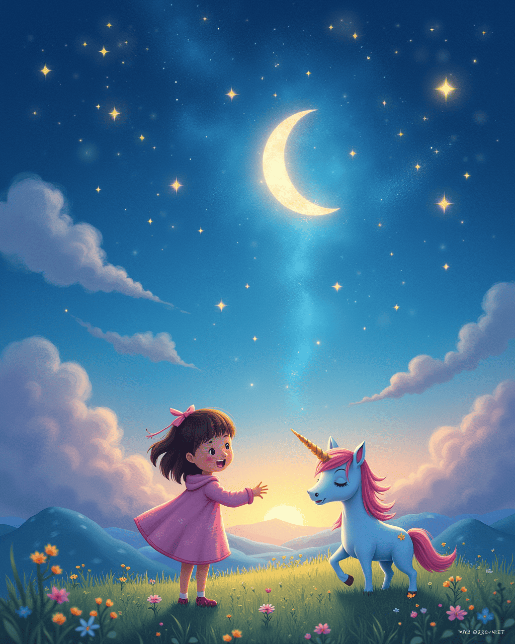 In her dream, a silver unicorn appeared, guiding Lily toward a valley of glowing stars. The unicorn whispered, “You are brave, Lily.” Lily felt a rush of confidence and decided to greet the stars with a bright smile. She danced among the constellations, feeling proud of her brave heart.