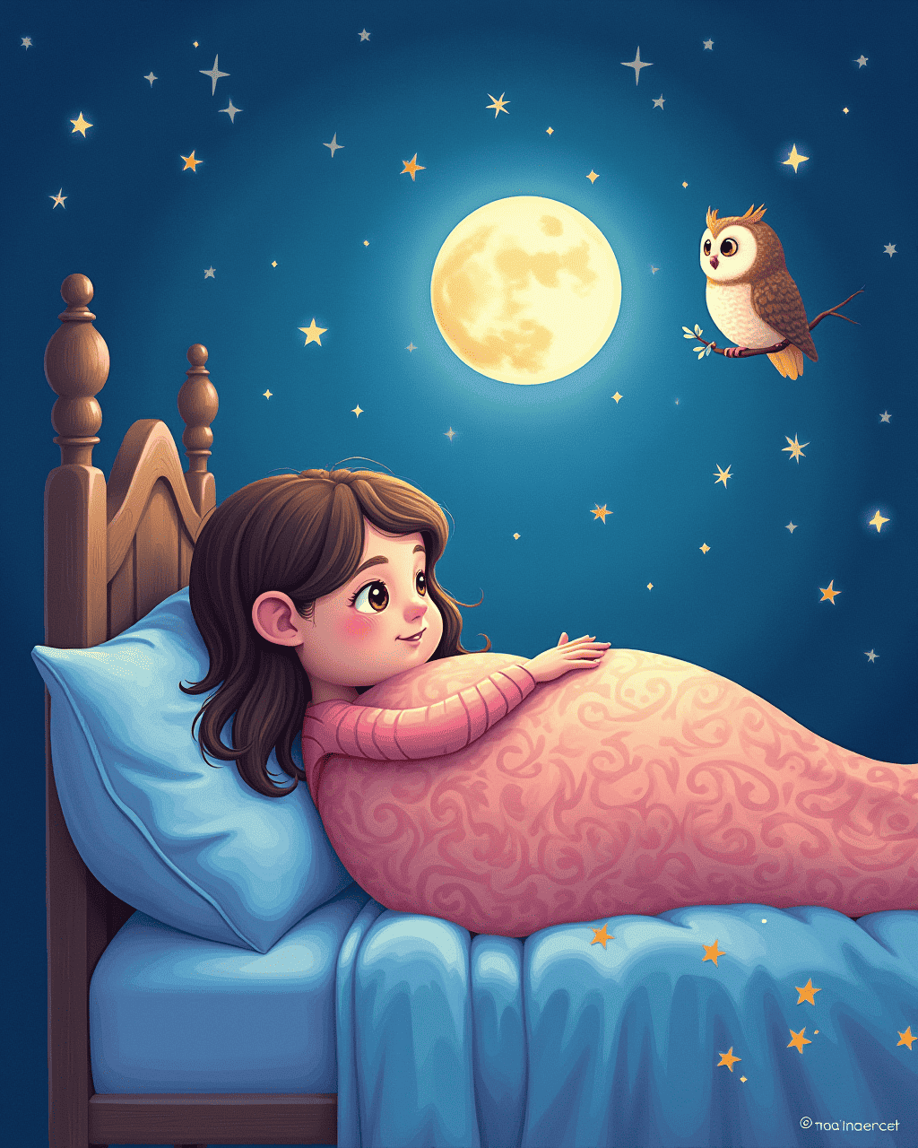 The next night, Lily slept in her own bed, still feeling the gentle presence of the owl in her dreams. She no longer feared the dark, instead, she welcomed it as a friend. Lily’s eyes sparkled with confidence, and she knew that her courage was growing bigger every day. She whispered to the moon, “Thank you, brave little star,” giving her a beautiful night's rest.
