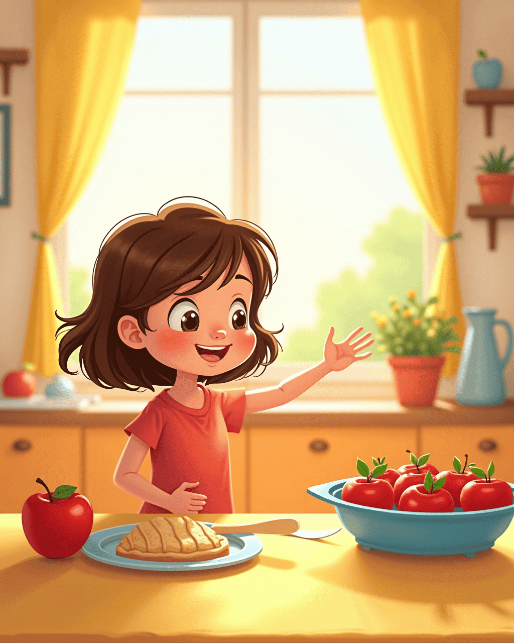 Sarah woke up to a bright, sunny kitchen. Her mother had baked a fresh apple pie. She tasted the sweet crust and felt a warm smile. The kitchen smelled like sunshine and love. Sarah decided she would do something kind this day.