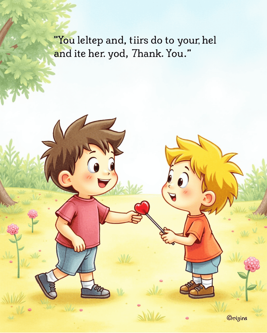During recess, Tim slipped on a banana peel and dropped his lollipop. The sweet red candy tumbled into the dust. Sarah picked it up and held it carefully. She offered it to Tim with a shy grin. Tim thanked her, but his smile looked a little sad.
