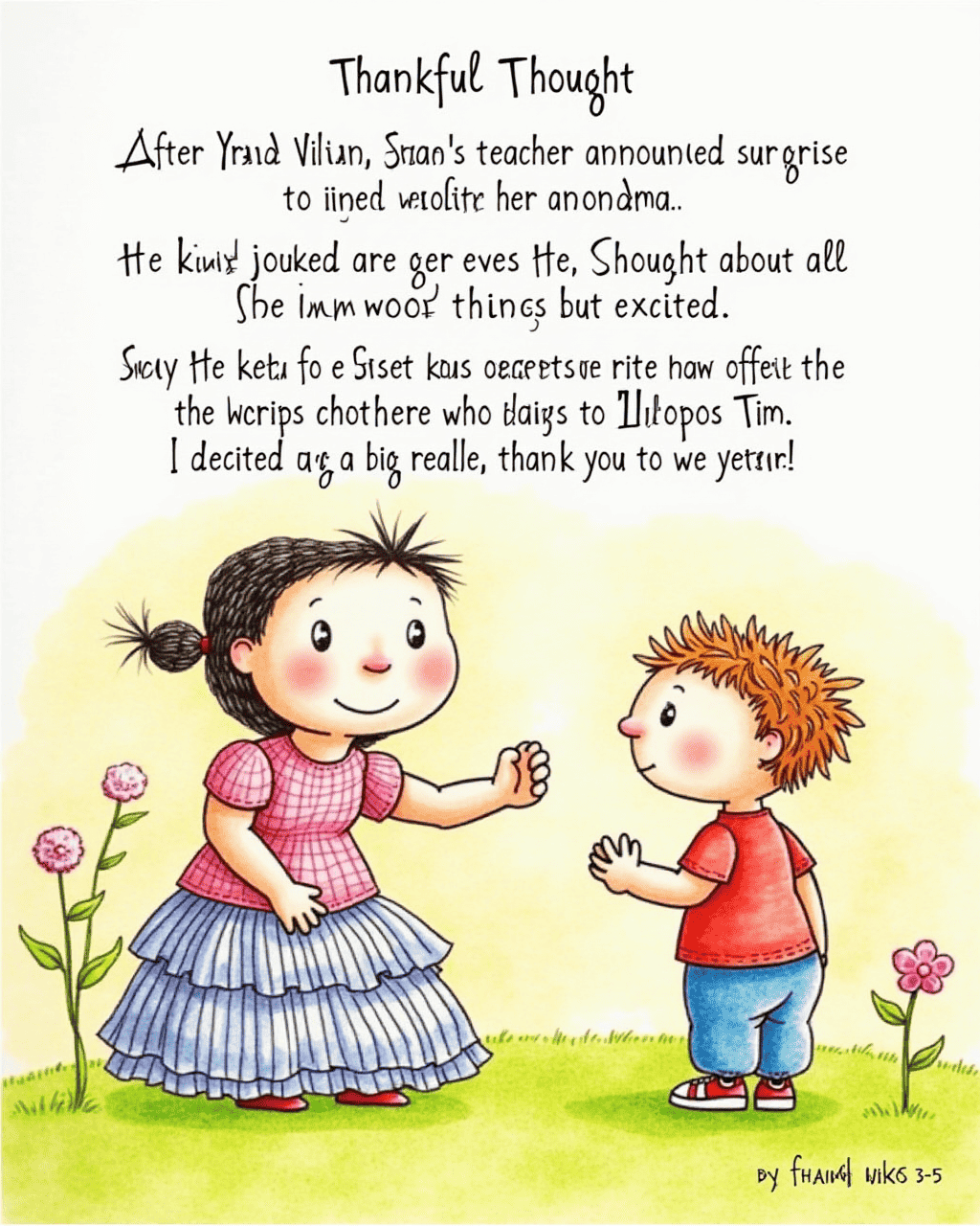 After lunch, Sarah’s teacher announced a surprise visit from her grandma. Sarah felt nervous but excited. She thought about all the kind things she had done. She remembered offering the lollipop to Tim. She decided to say a big, sincere thank you to everyone.
