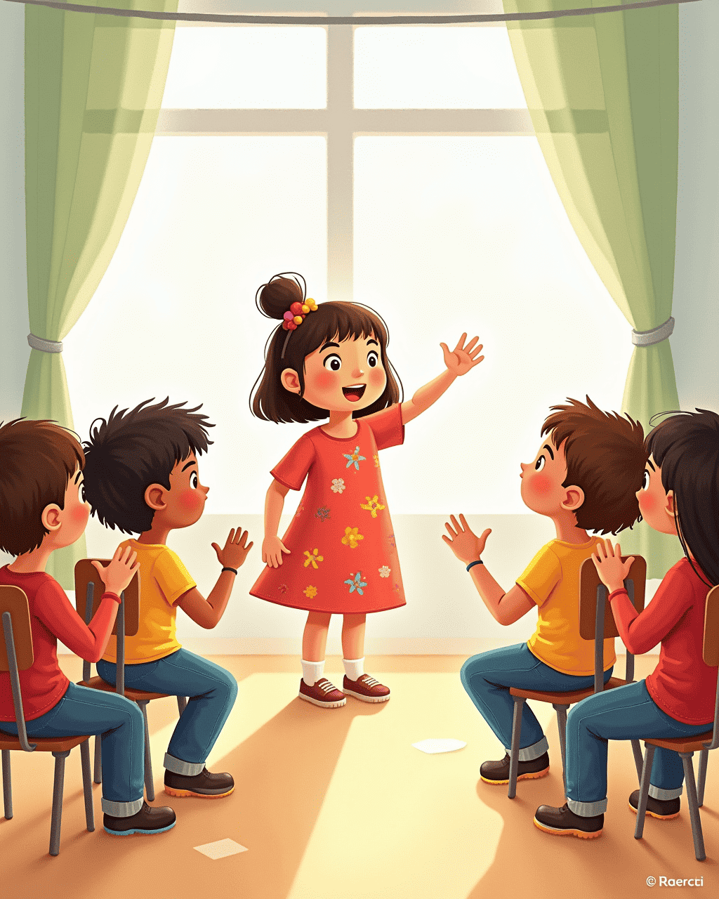 At the end of the day, Sarah stood before her classmates. She raised her hand and said, \"Thank you, everyone.\" The room filled with cheers and warm smiles. Everyone felt grateful for Sarah’s kind heart. Sarah felt a bright glow inside her.