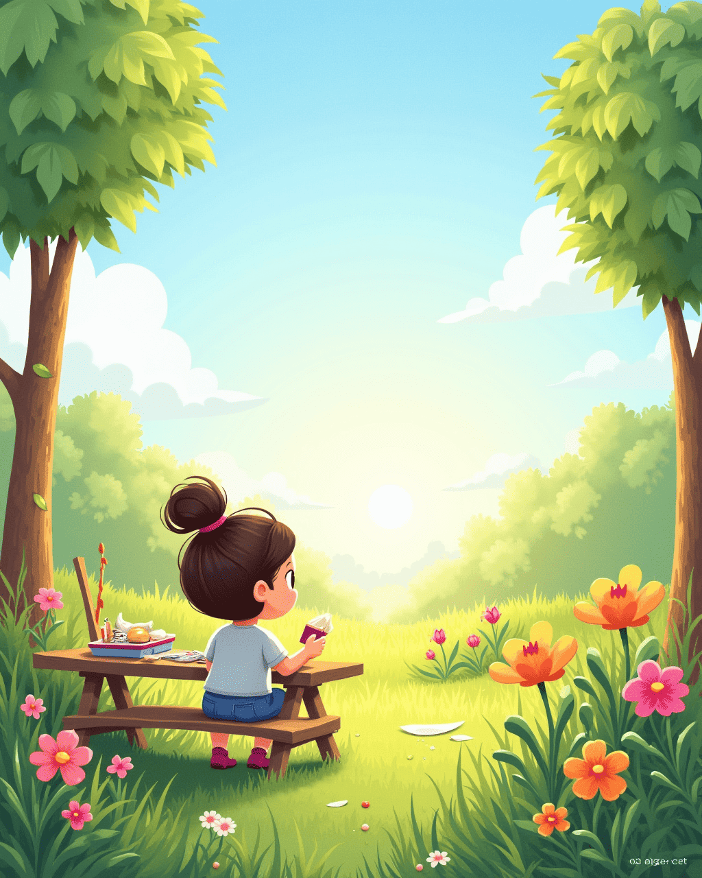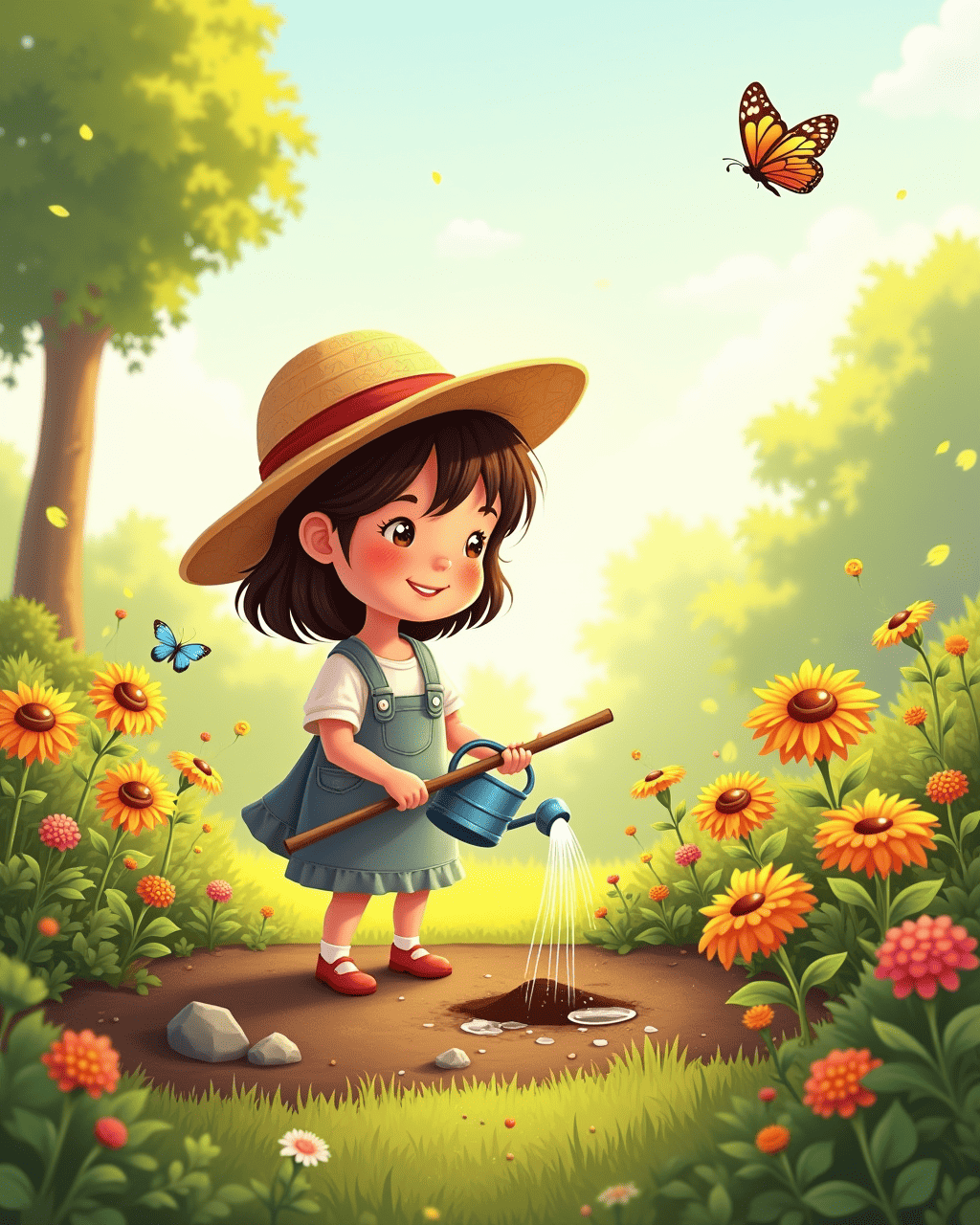 Outside, the garden was buzzing with butterflies. I wore a cute straw hat and used a small shovel to dig tiny holes for new seedlings. I gently planted bright marigolds and tall sunflowers. I watered them with a watering can, listening to the gentle splash. I imagined the plants growing tall and strong.