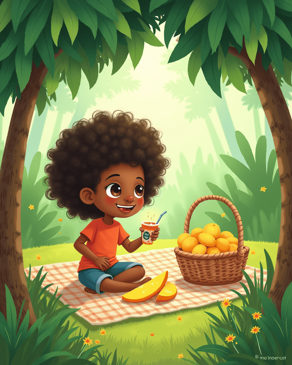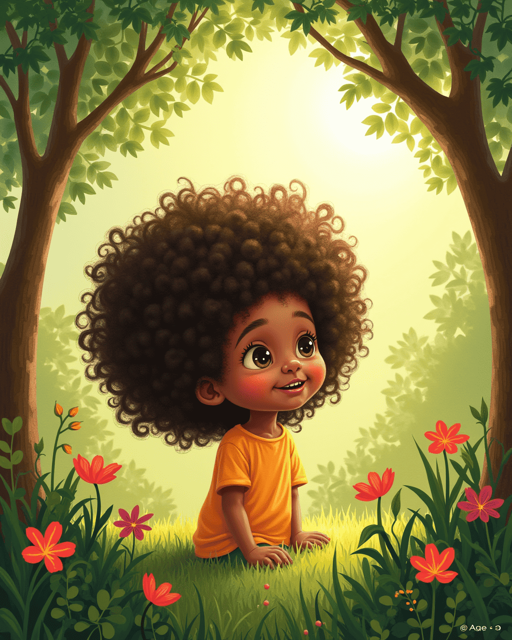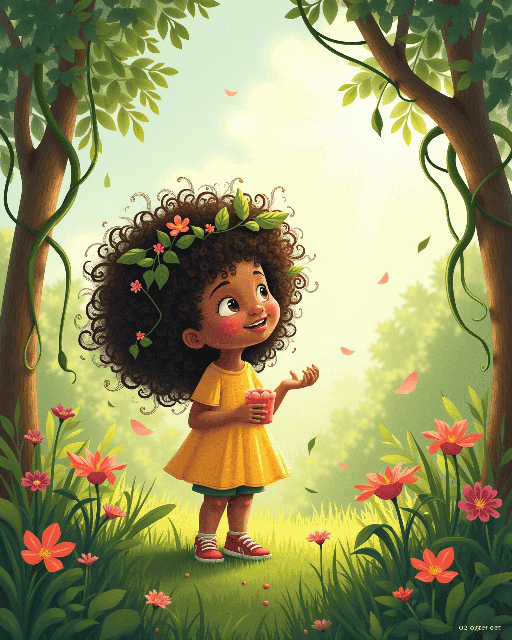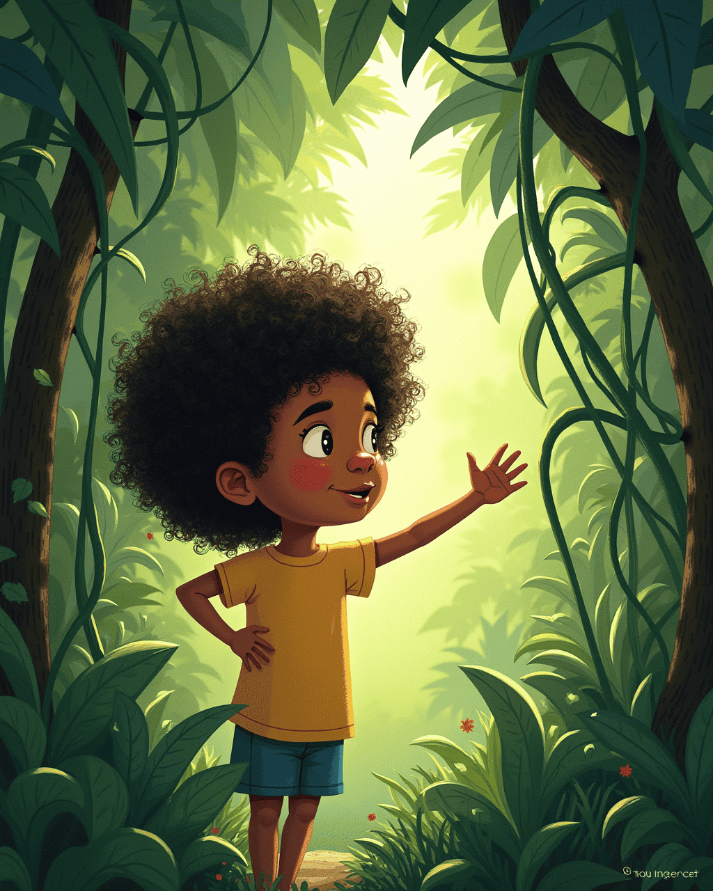 As night fell, the jungle in my hair began to shrink. The vines relaxed, and the leaves turned to dandelion fluff before gently drifting away. My hair settled back into neat curls, but the memory of the jungle remained. I tucked myself into bed with a smile, grateful for the magical adventure. Tomorrow, I will dream of the new jungle I will find in my thoughts.